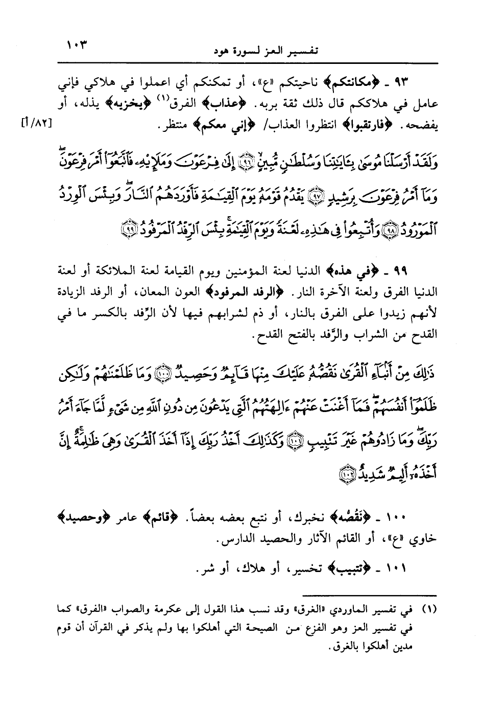 93 - {مكانتكم} ناحيتكم " ع "، أو تمكنكم أي اعملوا في هلاكي فإني عامل في هلاككم قال ذلك ثقة بربه. {عَذَابٌ} الفرق {يُخْزِيهِ} يذله، أو يفضحه. {فارتقبوا} انتظروا العذاب / [82 / أ] {إني معكم} منتظر. {ولقد أرسلنا موسى بئاياتنا وسلطان مبين إلى فرعون وملإيه فاتبعوا أمر فرعون وما أمر فرعون برشيد يقدم قومه يوم القيامة فأوردهم النار وبئس الورد المورود وأتبعوا في هذه لعنةً ويوم القيامة بئس الرفد المرفود}