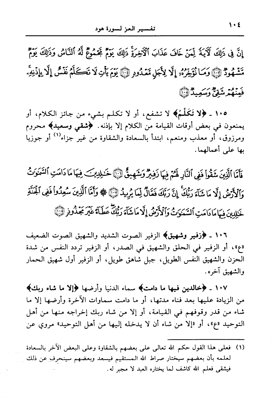 105 - {لا تَكَلَّمُ} لا تشفع، أو لا تكلم بشيء من جائز الكلام، أو يمنعون في بعض أوقات القيامة من الكلام إلا بإذنه. {شَقِىٌّ وَسَعِيدٌ} محروم ومرزوق، أو معذب ومنعم، ابتدأ بالسعادة والشقاوة من غير جزاء أو جوزيا بها على أعمالهما. {فأما الذين شقوا ففي النار لهم فيها زفيرٌ وشهيق خالدين فيها ما دامت السموات والأرض إلا ما شاء ربك إن ربك فعالٌ لما يريد وأما الذين سعدوا ففي الجنة خالدين فيها ما دامت السموات والأرض إلا ما شاء ربك عطاءً غير مجذوذٍ}