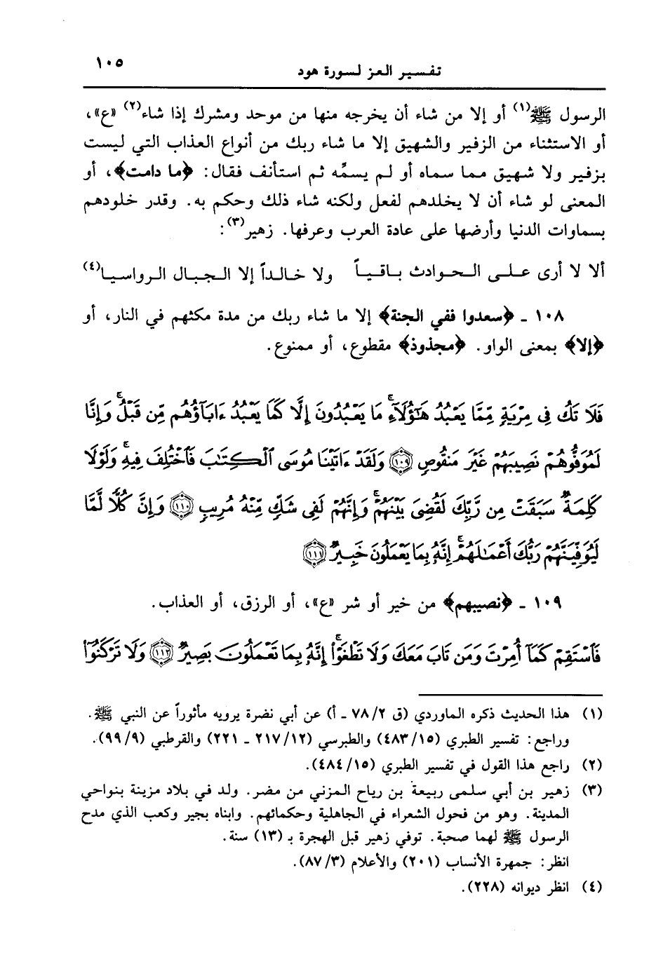 108 - {سُعِدُواْ فَفِى الْجَنَّةِ} إلا ما شاء ربك من مدة مكثهم في النار، أو {إِلاَّ} بمعنى الواو. {مجذوذ} مقطوع، أو ممنوع. {فلا تك في مريةْ مما يعبد هؤلاء ما يعبدون إلا كما يعبد ءاباؤهم من قبل وإنا لموفوهم نصيبهم غير منقوص ولقد ءاتينا موسى الكتاب فاختلف فيه ولولا كلمةٌ سبقت من ربك لقضى بينهم وإنهم لفى شك منه مريب وإن كلا لما ليوفينهم ربك أعمالهم إنه بما يعملون خبير}