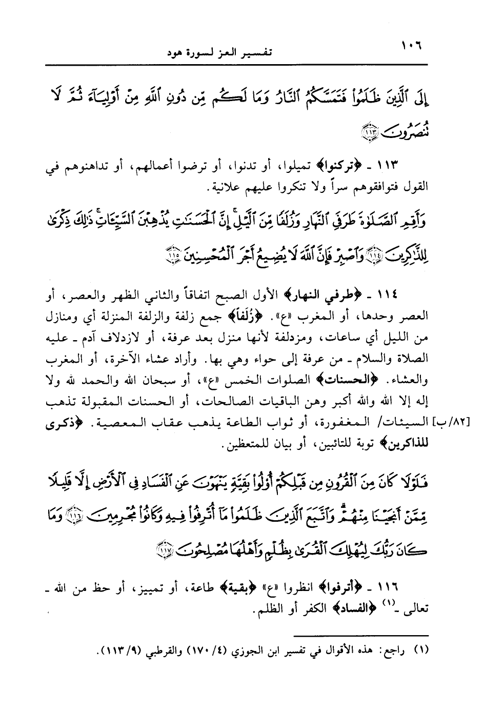 114 - {طرفي النهار} الأول اصبح اتفاقاً والثاني الظهر والعصر، أو العصر وحدها، أو المغرب " ع "، {زلفاً} جمع زلفة والزلفة المنزلة أي ومنازل من الليل أي ساعات، ومزدلفة لأنها منزل بعد عرفة، أو لازدلاف آدم - عليه الصلاة والسلام - من عرفة إلى حواء وهي بها. وأراد عشاء الآخرة، أو المغرب والعشاء. {الْحَسَنَاتِ} الصلوات الخمس " ع "، أو سبحان الله والحمد لله ولا إله إلا الله والله أكبر وهن الباقيات الصالحات، أو الحسنات المقبولة تذهب السيئات / [82 / ب] المغفورة، أو ثواب الطاعة يذهب عقاب المعصية. {ذِكْرَى لِلذَّاكِرِينَ} توبة للتائبين، أو بيان للمتعظين. {فلولا كان من القرون من قبلكم أولوا بقيةٍ ينهون عن الفساد في الأرض إلا قليلاً ممن أنجينا منهم واتبع الذين ظلموا ما أترفوا فيه وكانوا مجرمين وما كان ربك ليهلك القرى بظلم وأهلها مصلحون}