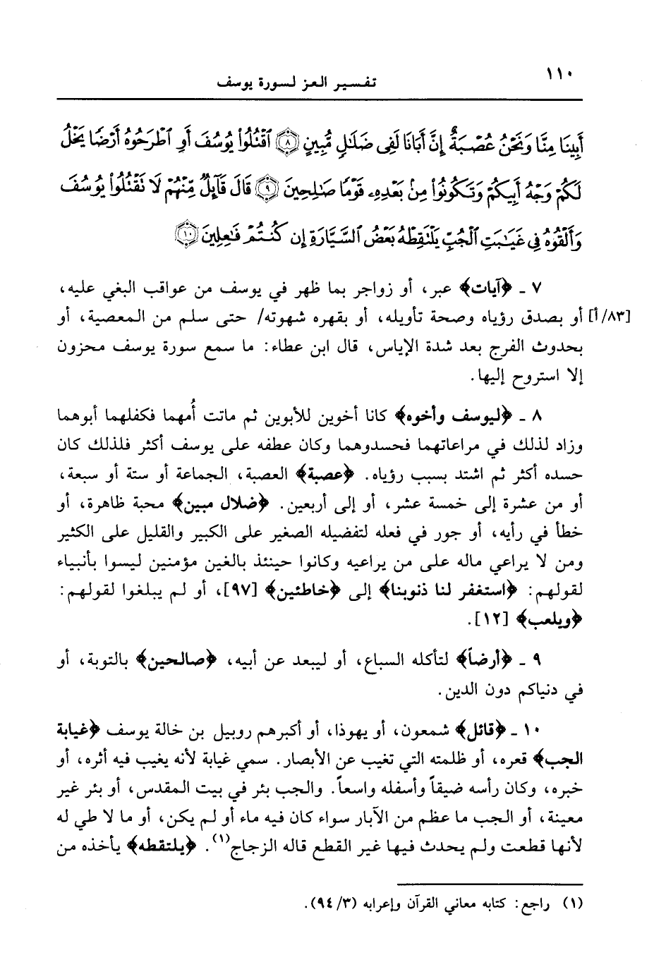 8 - {لَيُوسُفُ وَأَخُوهُ} كانا أخوين للأبوين ثم ماتت أُمهما فكفلهما أبوهما وزاد لذلك في مراعاتهما فحسدوهما وكان عطفه على يوسف أكثر فلذلك كان حسده أكثر ثم اشتد بسبب رؤياه. {عُصْبَةٌ} العصبة، الجماعة أو ستة أو سبعة، أو من عشرة إلى خمسة عشرة، أو إلى أربعين. {ضَلالٍ مُّبِينٍ} محبة ظاهرة، أو خطأ في رأيه، أو جور في فعله لتفضيله الصغير على الكبير والقليل على الكثير ومن لا يراعي ماله على من يراعيه وكانوا حينئذ بالغين مؤمنين ليسوا بأنبياء لقولهم: {استغفر لنا ذنوبنا) {الي} (خاطئين} [97] ، أو لم يبلغوا لقولهم: {ويلعب} [12] .