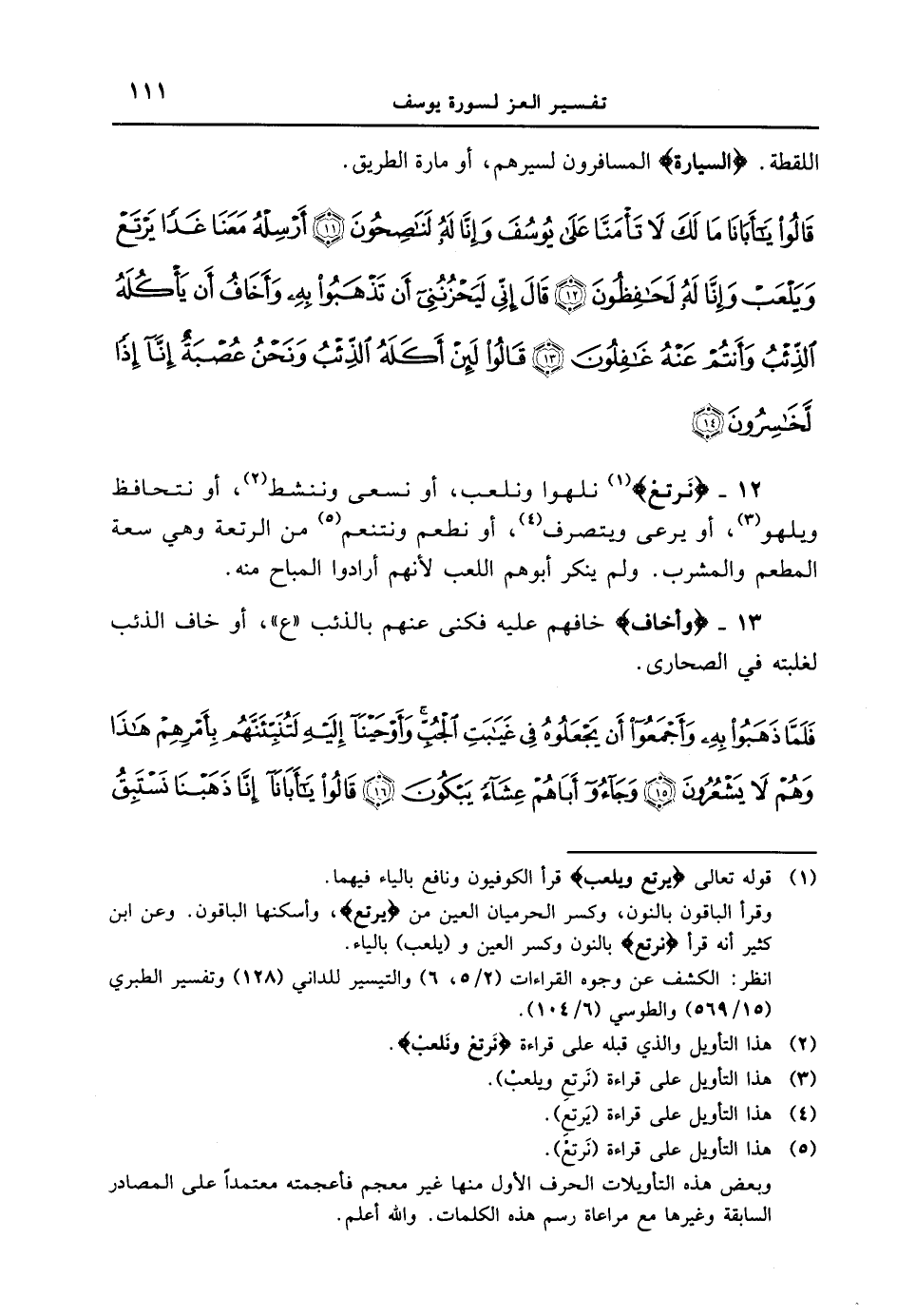 12 - {نرتع} نلهوا ونلعب، أو نسعى وننشط، أو نتحافظ ويلهو، أو يرعى ويتصرف، أو نطعم ونتنعم من الرتعة وهي سعة المطعم والمشرب. ولم ينكر أبوهم اللعب لأنهم أرادوا المباح منه.
