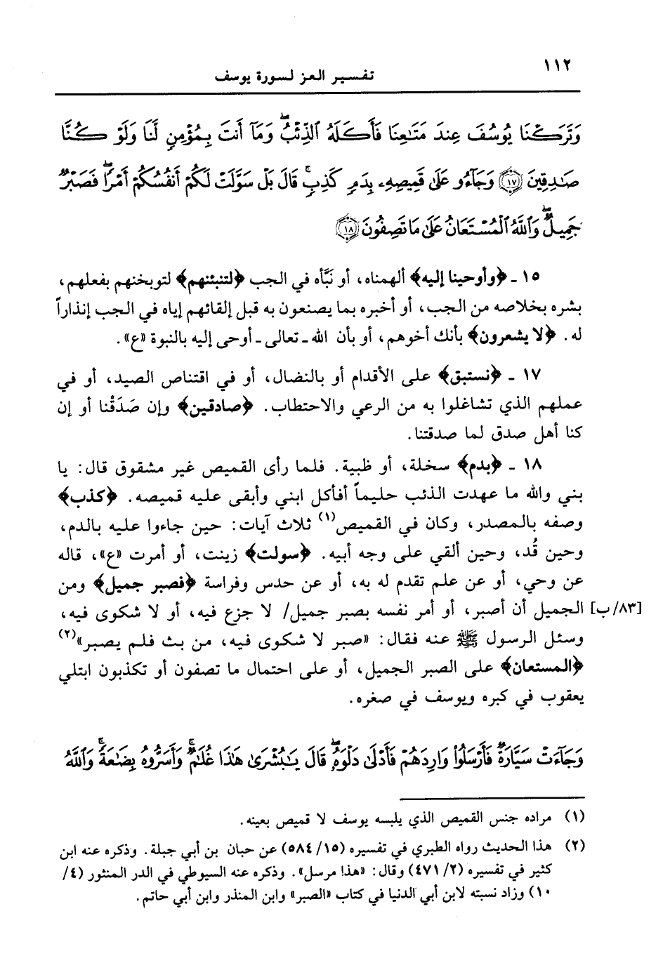 18 - {بِدَمٍ} سخلة، أو ظبية. فلما رأى القميص غير مشقوق قال: يا بني والله ما عهدت الذئب حليماً أفأكل ابني وأبقى عليه قميصه. {كَذِبٍ} وصفه بالمصدر، وكان في القميص ثلاث آيات: حين جاءوا عليه بالدم، وحين قُد، وحين أُلقي على وجه أبيه. {سَوَّلَتْ} زينب، أو أمرت " ع "، قاله عن وحي، أو عن علم تقدم له به، أو عن حدس وفراسة {فَصَبْرٌ جَمِيلٌ} ومن الجميل أن أصبر، أو أمر نفسه بصبر جميل / لا جزع فيه، أو لا شكوى فيه، وسئل الرسول [صلى الله عليه وسلم] عنه فقال: " صبر لا شكوى فيه، من بث فلم يصبر " {الْمُسْتَعَانُ} على الصبر الجميل، أو على احتمال ما تصفون أو تكذبون ابتُلي يعقوب في كبره ويوسف في صغره. {وجآءت سيّارة فأرسلوا واردهم فأدلى دلوه قال يابشرى هذا غلام وأسرّوه بضاعة والله