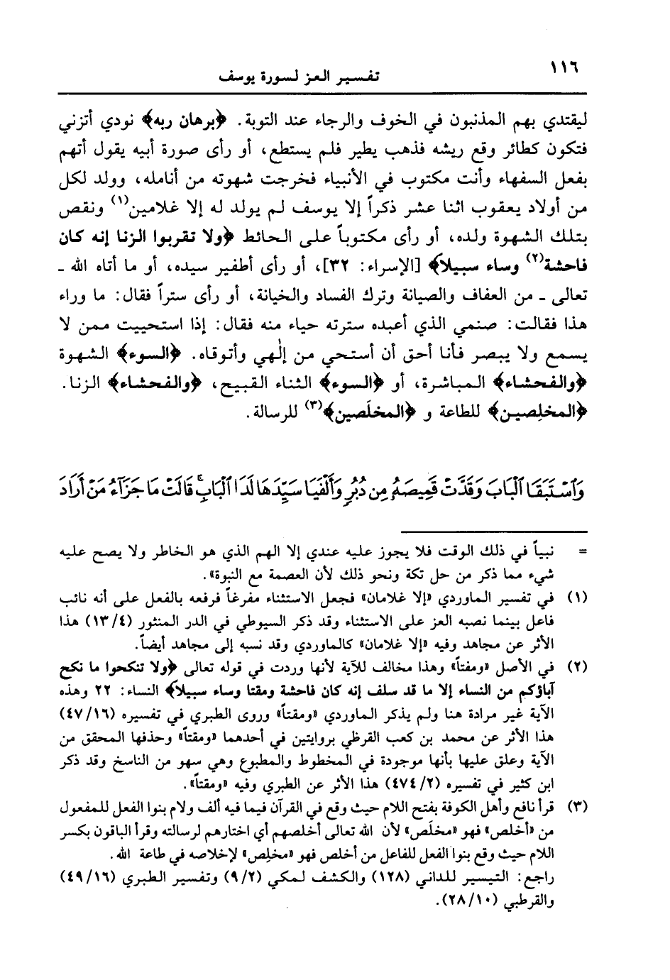 ليقتدى بهم المذنبون في الخوف والرجاء عند التوبة. {بُرهَانَ رَبِّهِ} نودي أتزني فتكون كطائر وقع ريشه فذهب يطير فلم يستطع، أو رأى صورة أبيه يقول أتهم بفعل السفهاء وأنت مكتوب في الأنبياء فخرجت شهوته من أنامله، وولد لكل من أولاد يعقوب اثنا عشر ذكراً إلا يوسف لم يولد له إلا غلامين ونقص بتلك الشهوة ولده، أو رأى مكتوباً على الحائط {ولا تقربوا الزنا إِنَّهُ كَانَ فَاحِشَةً وَسَآءَ سَبِيلاً} [الإسراء: 32] ، أو رأى أطفير سيده، أو ما أتاه الله - تعالى - من العفاف والصيانة وترك الفساد والخيانة، أو رأى ستراً فقال: ما وراء هذا فقالت: صنمي الذي أعبده سترته حياء منه فقال: إذا استحييت ممن لا يسمع ولا يبصر فأنا أحق أن أستحي من إلهي وأتوقاه. {السُّوءَ} الشهوة {وَالْفَحْشَآءَ} المباشرة، أو {السُّوءَ} الثناء القبيح، {وَالْفَحْشَآءَ} الزنا. {الْمُخْلَصِينَ} للطاعة و {المخلصين} للرسالة. {واستبقا الباب وقدت قميصه من دبرٍ وألفيا سيّدها لدا الباب قالت ماجزاء من أراد