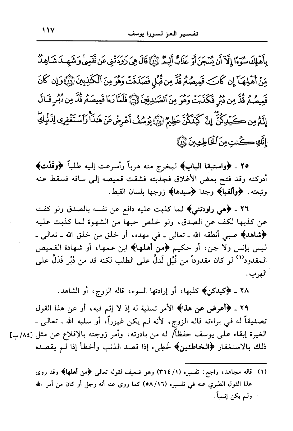 25 - {وَاسْتَبَقَا الْبَابَ} ليخرج منه هرباً وأسرعت إليه طلباً {وَقَدَّتْ} أدركته وقد فتح بعض الأغلاق فجذبته فشقت قميصه إلى ساقه فسقط عنه وتبعته. {وَالْفَيَا) {وجدا} (سَيِّدَهَا} زوجها بلسان القبط.