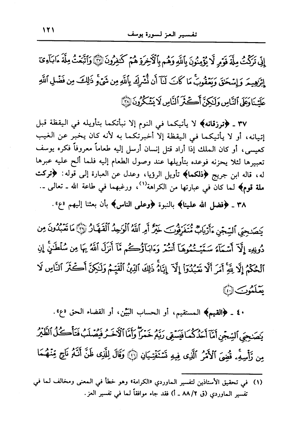 إنى تركت ملة قوم لا يؤمنون بالله وهم بالأخرة هم كافرون واتبعت ملة ءاباءى إبراهيم وإسحاق ويعقوب ما كان لنا أن نشرك بالله من شئٍ ذلك من فضل الله علينا وعلى الناس ولكن أكثر الناس لا يشكرون}