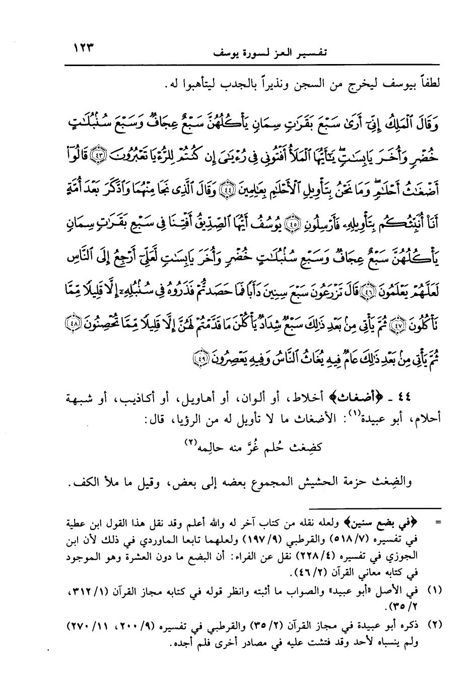 44 - {أَضْغَاثُ} أخلاط، أو ألوان، أو أهاويل، أو أكاذيب، أو شبهة أحلام، أبو عبيدة: الأضغاث ما لا تأويل له من الرؤيا، قال: كضِغث حُلم غُرَّ منه حالِمه والضِغث حزمة الحشيش المجموع بعضه إلى بعض، وقيل ما ملأ الكف.