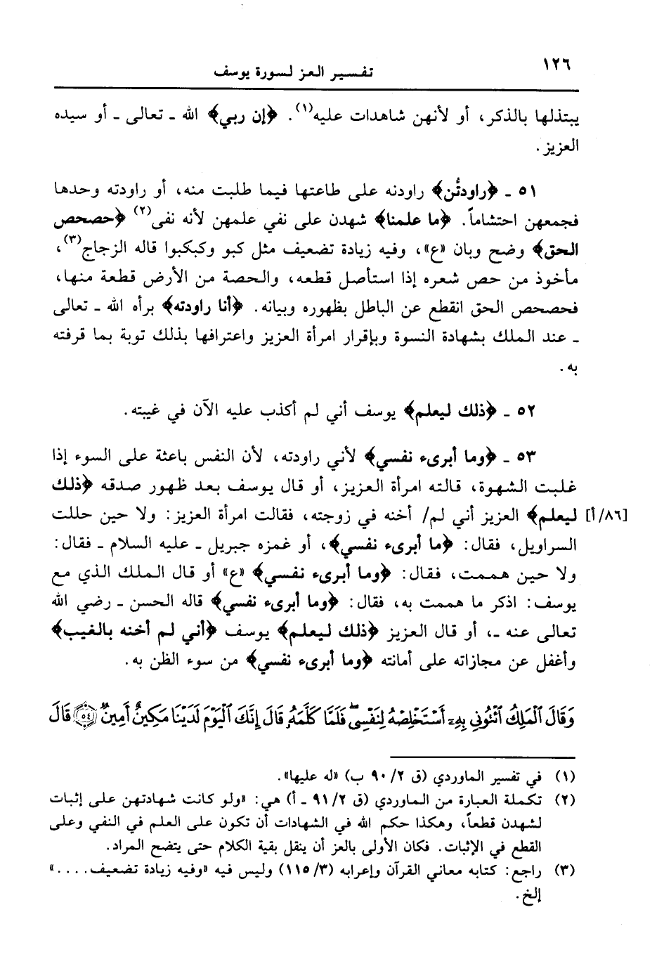 يبتذلها بالذكر، أو لأنهن شاهدات عليه. {إِنَّ رَبِّى} الله - تعالى - أو سيده العزيز. 51 - {رَاوَدتُّنَّ} راودنه على طاعتها فيما طلبت منه، أو راودته وحدها فجمعهن احتشاماً. {مَا عَلِمْنَا} شهدن على نفي علمهن لأنه نفى {حَصْحَصَ الْحَقُّ} وضع وبان " ع "، وفيه زيادة تضعيف مثل كبو وكبكوا قاله الزجاج، مأخوذ من حص شعره إذا استأصل قطعه، والحصة من الأرض قطعة منها، فحصحص الحق انقطع عن الباطل بظهوره وبيانه. {أَنَاْ رَاوَدتُّهُ} برأة الله - تعالى - عند الملك بشهادة النسوة وبإقرار امرأة العزيز واعترافها بذلك توبة بما قرفته به.