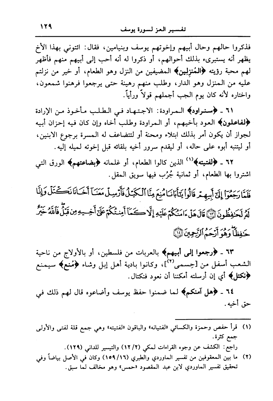 61 - {سَنُرَاوِدُ} المراودة: الاجتهاد في الطلب مأخوذ من الإرادة {لفاعلون} العود بأخيهم، أو المرادوة وطلب أخاه وإن كان فيه إحزان أبيه لجواز أن يكون أمر بذلك ابتلاء ومحنة أو لتتضاعف له المسرة برجوع الابنين، أو ليتنبه أبوه على حاله، أو ليقدم سرور أخيه بلقائه قبل إخوته لميله إليه.