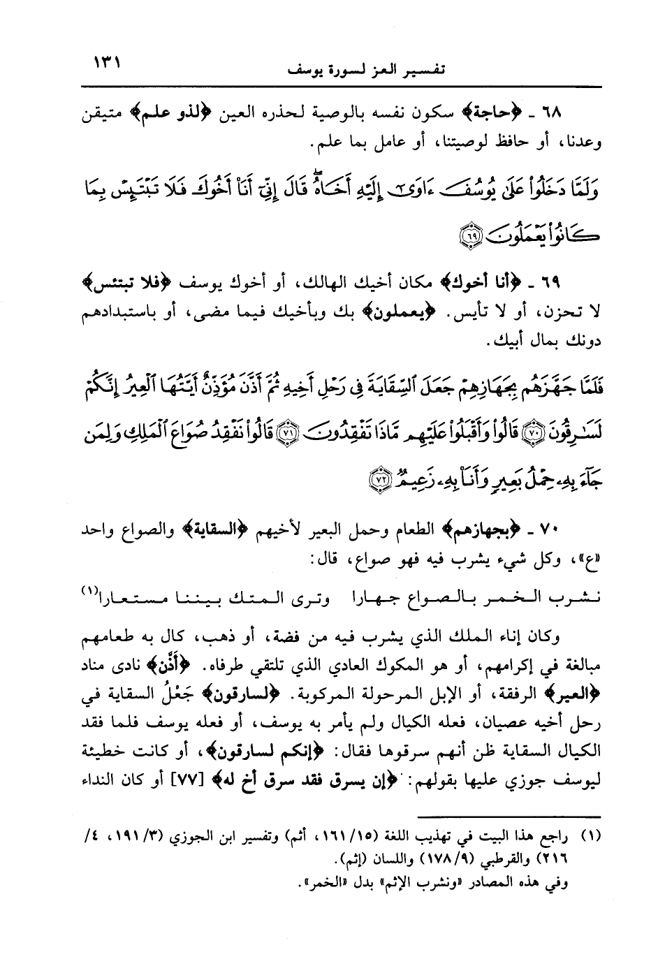 69 - {أَنَاْ أَخُوكَ} مكان أخيك الهالك، أو أخوك يوسف {فَلا تَبْتَئِسْ} لا تحزن، أو لا تأيس. {يَعْمَلُونَ} بك وبأخيك فيما مضى، أو باستبدادهم دونك بمال أبيك. {فلما جهزهم بجهازهم جعل السقاية في رحل أخيه ثم أذن مؤذن أيتها العير إنكم لسارقون قالوا وأقبلوا عليهم ماذا تفقدون قالوا نفقد صواع الملك ولمن جاء به حمل بعير وأنا به زعيم}