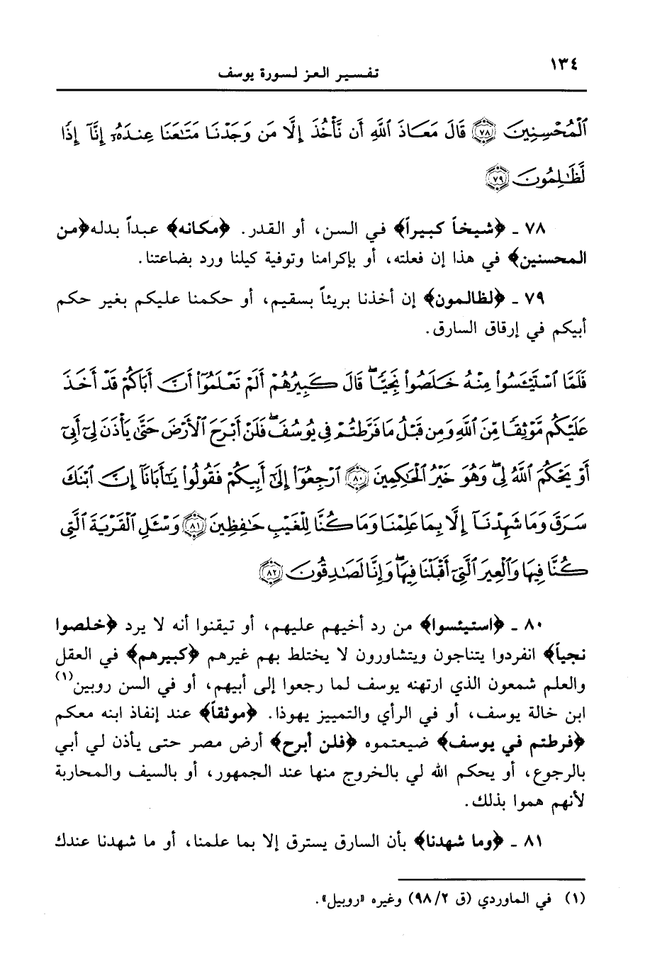 79 - {لظالمون} إن أخذنا برئياً بسقيم، أو حكمنا عليكم بغير حكم أبيكم في إرقاق السارق. {فلمّا استيئسوا منه خلصوا نجيّاً قال كبيرهم ألم تعلموا أن أباكم قد أخذ عليكم موثقاً من الله ومن قبل ما فرّطتم في يوسف فلن أبرح الأرض حتى يأذن لي أبي أو يحكم الله لي وهو خير الحاكمين ارجعوا إلى أبيكم فقولوا يا أبانا إن ابنك سرق وما شهدنا إلا بما علمنا وما كنّا للغيب حافظين وسئل القرية التي كنّا فيها والعير التي أقبلنا فيها وإنا لصادقون}
