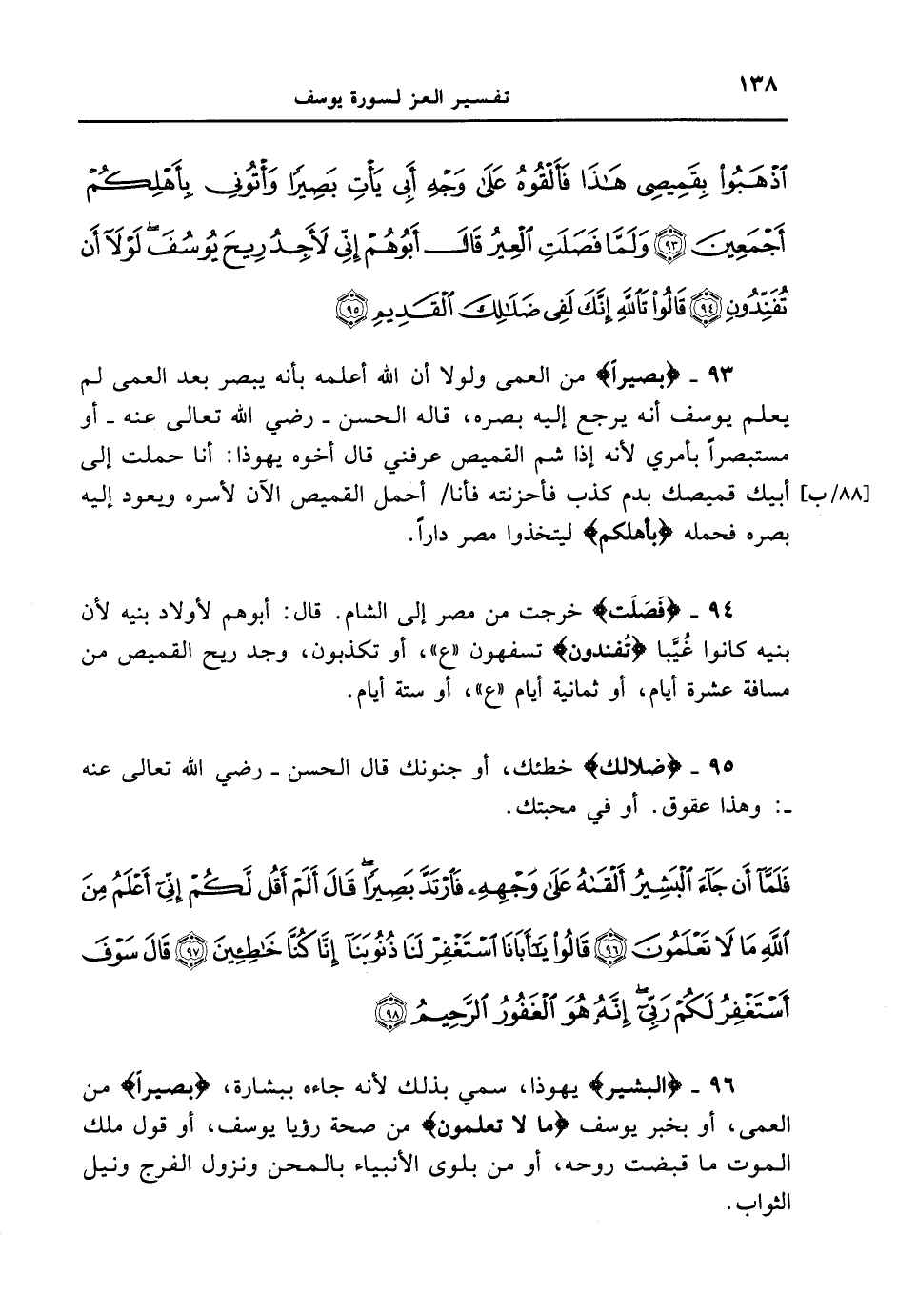 94 - {فَصَلَتِ} خرجت من مصر إلى الشام. قال: أبوهم لأولاد بنيه لأن بنيه كانوا غُيَّبا {تُفَنِّدُونِ} تسفهون " ع "، أو تكذبون، وجد ريح القميص من مسافة عشرة أيام، أو ثمانية أيام " ع "، أو ستة أيام.