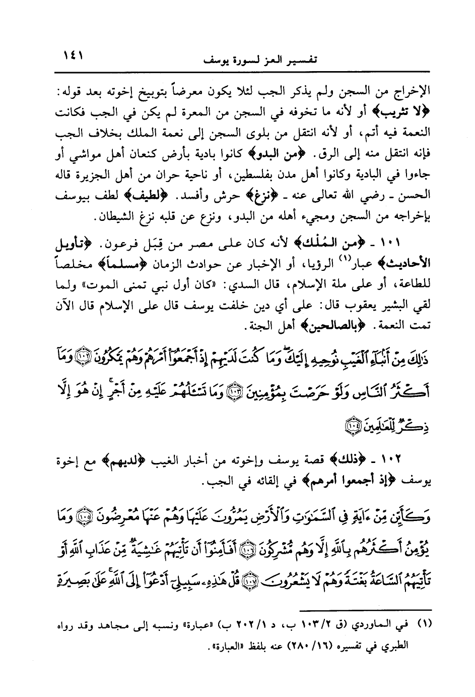 101 - {مِنَ الْمُلْكِ} لأنه كان على مصر من قِبَل فرعون. {تَأْوِيلِ الأَحَادِيثِ} عبار الرؤيا، أو الإخبار عن حوادث الزمان {مُسْلِماً} مخلصاً للطاعة، أو على ملة الإسلام، قال السدي: " كان أول نبي تمنى الموت " ولما لقي البشير يعقوب قال: على أي دين خلفت يوسف قال على الإسلام قال الآن تمت النعمة. {بالصالحين} أهل الجنة. {ذلك من أنباء الغيب نوحيه إليك وما كنت لديهم إذا أجمعوا أمرهم وهم يمكرون وما أكثر الناس ولو حرصت بمؤمنين وما تسئلهم عليه من أجرٍ إن هو إلا ذكرٌ للعالمين}