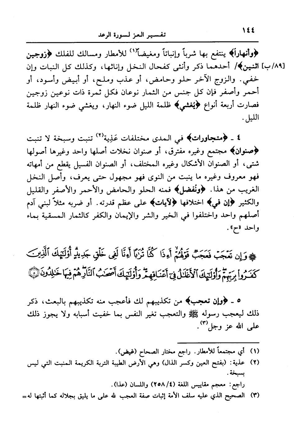 4 - {مُّتَجَاوِرَاتٌ} في المدى مختلفات عَذِية تنبت وسبخة لا تنبت {صِنْوَانٌ} مجتمع وغيره مفترق، أو صنوان نخلات أصلها واحد وغيرها أصولها شتى، أو الصنوان الأشكال وغيره المختلف، أو صنوان الفسيل يقطع من أمهاته فهو معروف وغيره ما ينبت من النوى فهو مجهول حتى يعرف، وأصل النخل الغريب من هذا. {وَنُفَضِّلُ} فمنه الحلو والحامض والأحمر والأصفر والقليل والكثير {إِنَّ فِى} اختلافها {لأَيَاتٍ} على عظم قدرته. أو ضربه مثلاُ لبني آدم أصلهم واحد واختلفوا في الخير والشر والإيمان والكفر كالثمار المسقية بماء واحد " ح ". {وَإن تَعْجَبْ فعجب قوّلهم أءذا كنّا تراباً لفى خلق جديد أولائك الذين كفروا بربهم وأولائك الأغلال فى أعماقهم وأولائك أصحاب النار هم فيها خالدون