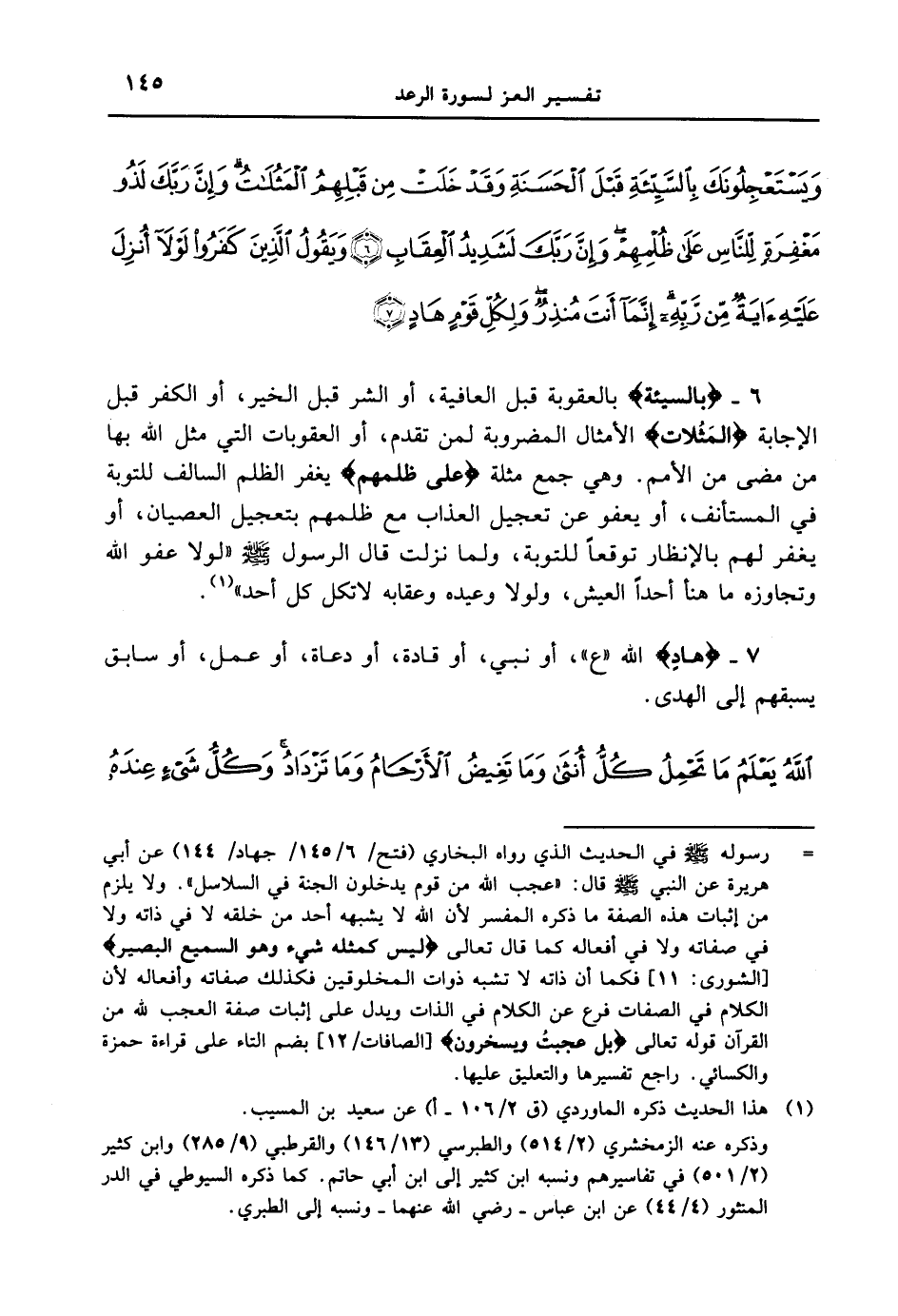 7 - {هَادٍ} الله " ع "، أو نبي، أو قادة، أو دعاة، أو عمل، أو سابق يسبقهم إلى الهدى. {الله يعلم ما تحمل كل أنثى وما تغيض الأرحام وما تزداد وكل شىء عنده