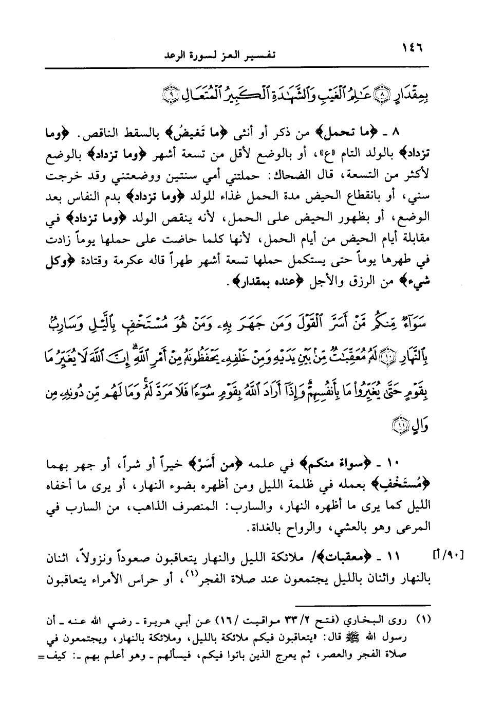 8 - {ما تحمل) {من ذكر أو أنثى} (ما تَغِيَضُ} بالسقط الناقص. {وَمَا تَزْدَادُ} بالولد التام " ع "، أو بالوضع لأقل من تسعة أشهر {وَمَا تَزْدَادُ} بالوضع لأكثر من التسعة، قال الضحاك: حملتني أمي سنتين ووضعتني وقد خرجت سني، أو بانقطاع الحيض مدة الحمل غذاء للولد {وَمَا تَزْدَادُ} بدم النفاس بعد الوضع، أو بظهور الحيض على الحمل، لأنه ينقص الولد {وَمَا تَزْدَادُ} في مقابلة أيام الحيض من أيام الحمل، لأنها كلما حاضت على حملها يوماً زادت في طهرها يوماً حتى يستكمل حملها تسعة أشهر طهراً قاله عكرمة وقتادة {وَكُلُّ شَىْءٍ} من الرزق والأجل {عِندَهُ بمقدار} . {سوآءٌ منكم من أسر القول ومن جهر به ومن هو مستخف بالّيل وسارب بالنّهار له معقبات من بين يديه ومن خلفه يحفظونه من أمر الله إن الله لا يغير ما بقوم حتى يغيروا ما بأنفسهم وإذا أراد الله بقوم سوءاً فلا مردّله وما لهم من دونه من والٍ}