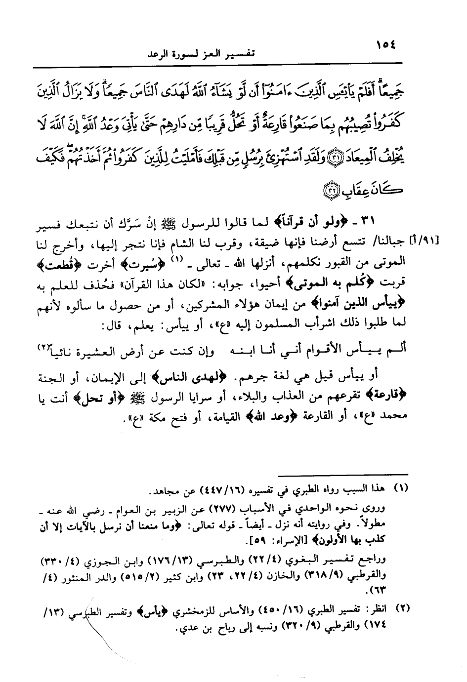 31 - {ولو أن قرآنا} لما قالوا للرسول [صلى الله عليه وسلم] إن سرك أن نتبعك فسير جبالنا / [91 / أ] تتسع أرضنا فإنها ضيقة، وقرب لنا الشام فإنا نتجر إليها، وأخرج لنا الموتى من القبور نكلمهم، أنزلها الله - تعالى - {سُيّرَتْ) {أخرت} (قُطِّعَتْ} قربت {كُلِّمَ بِهِ الْمَوْتَى} أحيوا، جوابه: " لكان هذا القرآن " فحذف للعلم به {ييأس الذين آمنوا} من إيمان هؤلاء المشركين، أو من حصول ما سألوه لأنهم لما طلبوا ذلك اشرأب المسلمون إليه " ع "، أو بيأس: يعلم، قال: