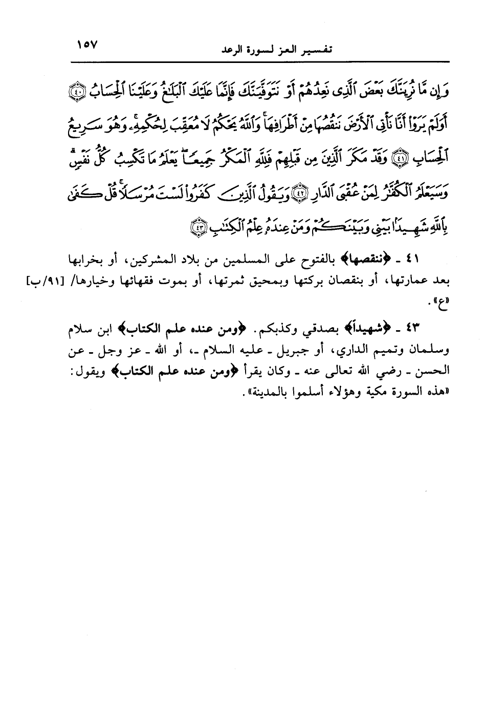 41 - {نَنقُصُهَا} بالفتوح على المسلمين من بلاد المشركين، أو بخرابها بعد عمارتها، أو بنقصان بركتها وبمحيق ثمرتها، أو بموت فقهائها وخيارها [91 / ب] " ع ".