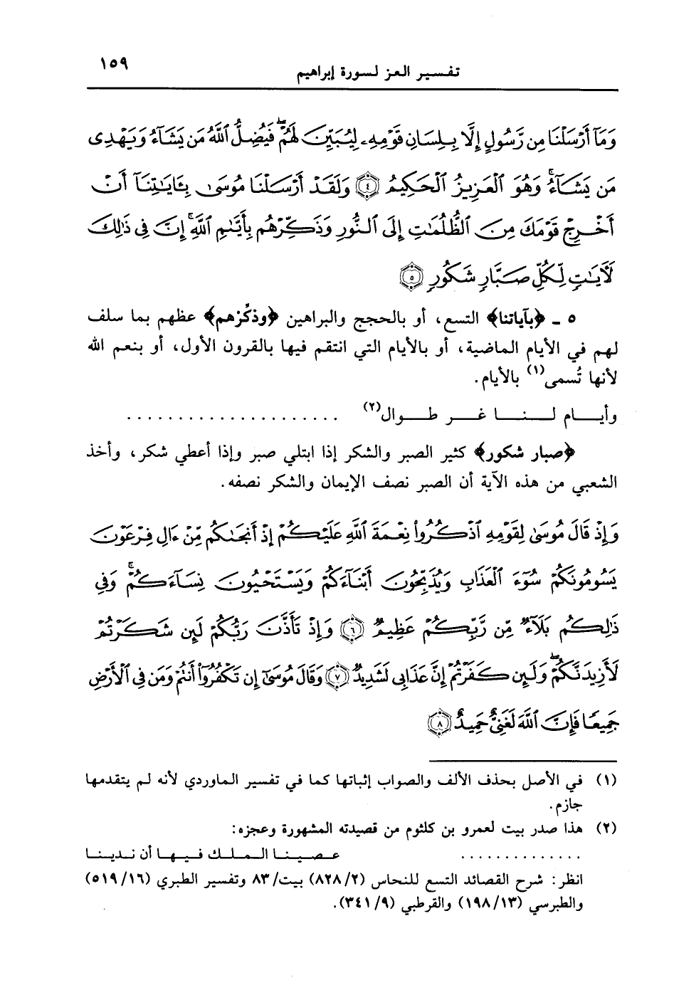 5 - {بَآَيَاتِنَآ} التسع، أو بالحجج والبراهين {وَذَكِّرْهُم} عظهم بما سلف لهم في الأيام الماضية، أو بالأيام التي انتقم فيها بالقرون الأول، أو بنعم الله لأنها تُسمى بالأيام.
