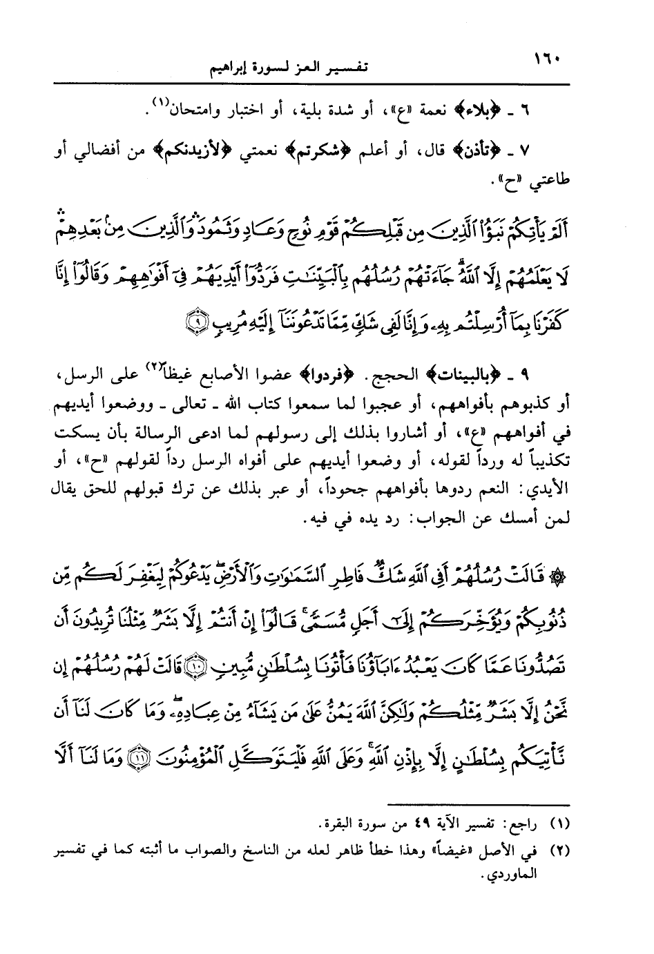 6 - {بَلآءٌ} نعمة " ع "، أو شدة بلية، أو اختبار وامتحان. \ 7 - {تَأَذَّنَ} قال، أو أعلم {شَكَرْتُمْ} نعمتي {لأَزِيدَنَّكُمْ} من أفضالي أو طاعتي " ح ". {ألم يأتكم نبؤا الذين من قبلكم قوم نوحٍ وعادٍ وثمود والذين من بعدهم لا يعلمهم إلا الله جاءتهم رسلهم بالبينات فردّوا أيديهم في أفواههم وقالوا إنّا كفرنا بما أرسلتم به وإنّا لفي شك ممّا تدعوننا إليه مريب}