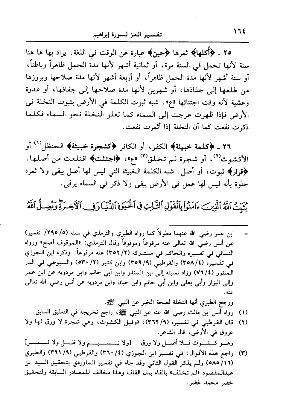 25 - {أُكُلَهَا} ثمرها {حِينِ} عبارة عن الوقت في اللغة. يراد بها ها هنا سنة لأنها تحمل في السنة مرة، أو ثمانية أشهر لأنها مدة الحمل ظاهراً وباطناً، أو ستة أشهر لأنها مدة الحمل ظاهراً، أو اربعة أشهر لأنها مدة صلاحها وبروزها من طلعها إلى جذاذها، أو شهرين لأنها مدة صلاحها إلى جفافها، أو غدوة وعشية لأنه وقت اجتنائها " ع ". شبه ثبوت الكلمة في الأرض بثبوت النخلة في الأرض فإذا ظهرت عرجت إلى السماء كما تعلو النخلة نحو السماء فكلما ذكرت نفعت كما أن النخلة إذا أثمرت نفعت.