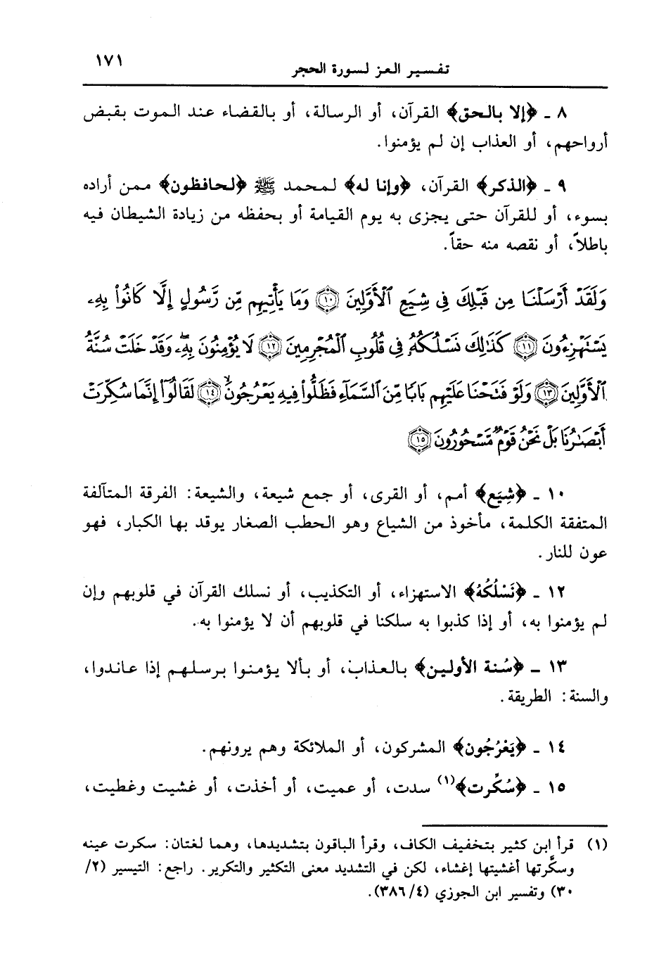 9 - {الذكر} القرآن، {وإنا له} لمحمد [صلى الله عليه وسلم] {لَحَافِظُونَ} ممن أراده بسوءٍ، أو للقرآن حتى يجزى به يوم القيامة أو بحفظه من زيادة الشيطان فيه باطلاً، أو نقصه منه حقاً. {ولقد أرسلنا من قبلك في شيع الأولين وما يأتيهم من رسولٍ إلا كانوا به يستهزءون كذلك نسلكه في قلوب المجرمين لا يؤمنون به وقد خلت سنة الأولين ولو فتحنا عليهم باباً من السماء فظلوا فيه يعرجون لقالوا إنمّا سكرت أبصارنا بل نحن قومٌ مسحورون}