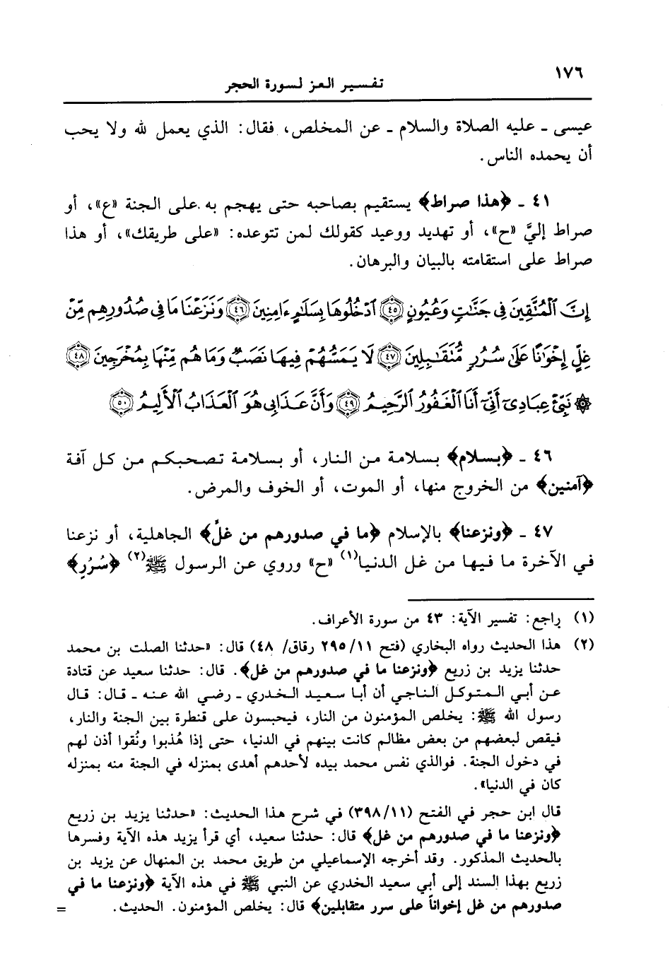 47 - {وَنَزَعْنَا} بالإسلام {مَا فِى صُدُورِهِم مِّنْ غِلٍّ} الجاهلية، أو نزعنا في الآخرة ما فيها من غل الدنيا " ح " وروي عن الرسول [صلى الله عليه وسلم] {سرر}