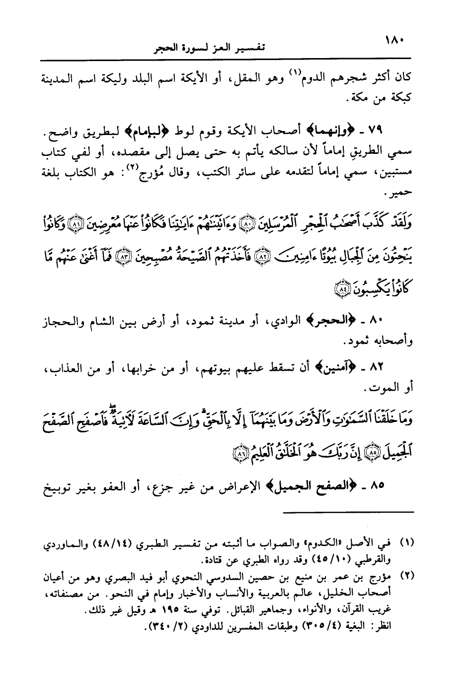 79 - {وَإِنَّهُمَا} أصحاب الأيكة وقوم لوط {لَبِإِمَامٍ} لبطريق واضح. سمي الطريق إماماً لأن سالكه يأتم به حتى يصل إلى مقصده، أو لفي كتاب مستبين، سمي إماماً لتقدمه على سائر الكتب، وقال مُؤرج: هو الكتاب بلغة حمير. {ولقد كذّب أصحاب الحجر المرسلين وءاتيناهم ءاياتنا فكانوا عنها معرضين وكانوا ينحتون من الجبال بيوتاً ءامنين فأخذتهم الصّيحة مصبحين فما أغنى عنهم ما كانوا يكسبون}