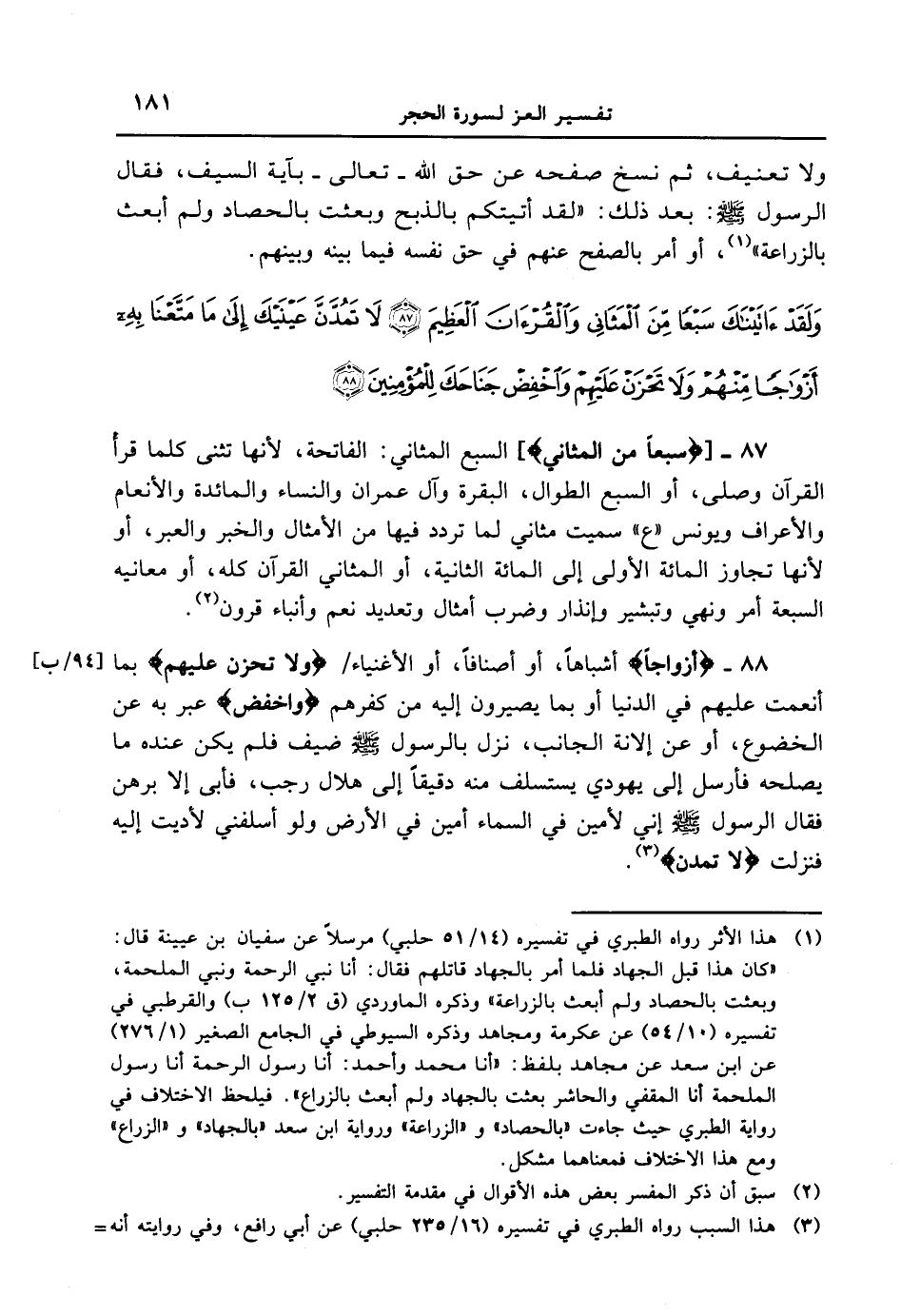 ولا تعنيف، ثم نسخ صفحه عن حق الله - تعالى - بآية السيف، فقال الرسول [صلى الله عليه وسلم] : بعد ذلك: " لقد أتيتكم بالذبح وبُعثت بالحصاد ولم أُبعث بالزراعة، أو أمر بالصفح عنهم في حق نفسه فيما بينه وبينهم. {ولقد ءاتيناك سبعاً من المثاني والقرءان العظيم لا تمدنّ عينيك إلى ما متّعنا به أزواجاً منهم ولا تحزن عليهم واخفض جناحك للمؤمنين 4}