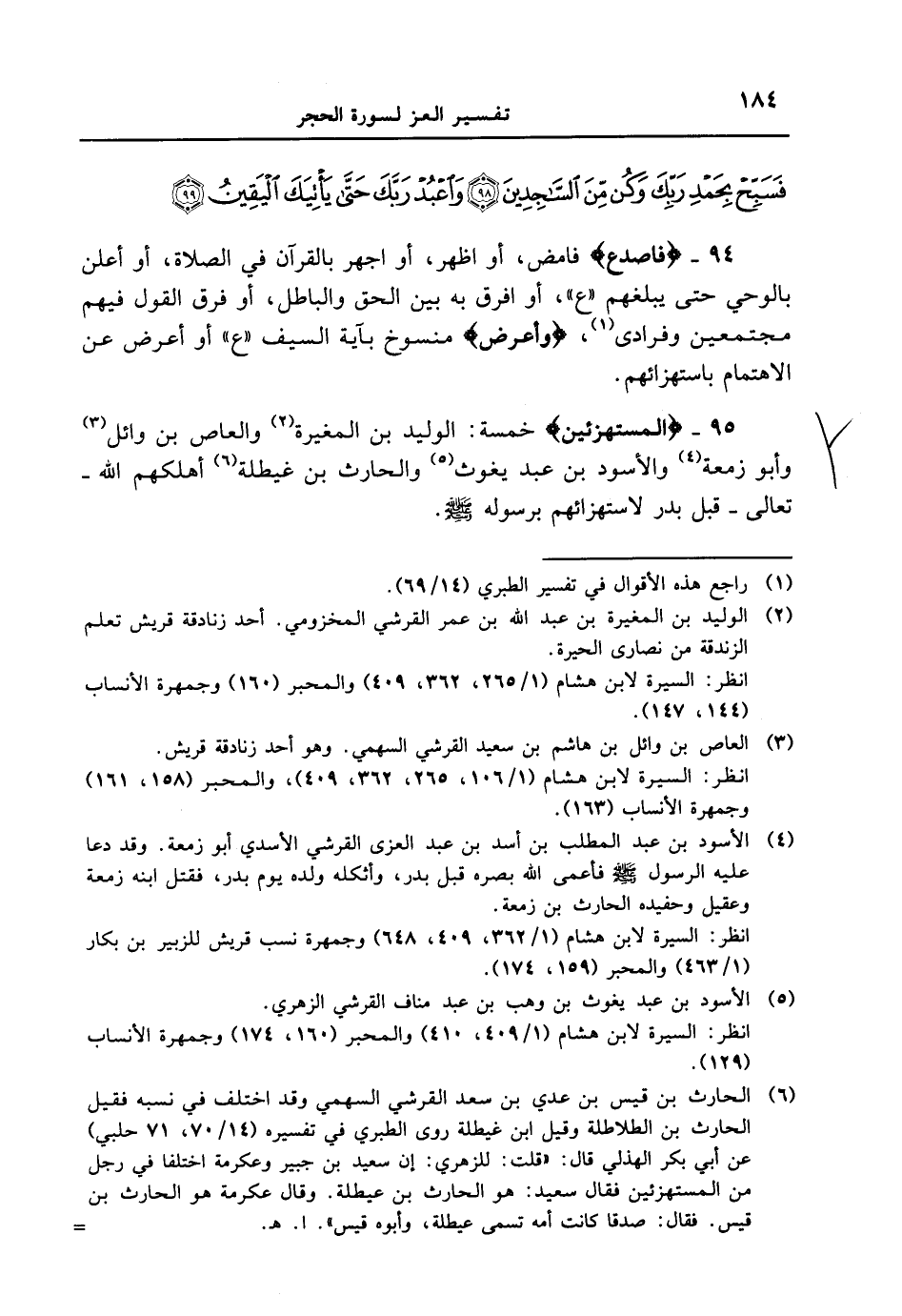 95 - {المستهزئين} خمسة: الوليد بن المغيرة والعاص بن وائل وأبو زمعة والأسود بن عبد يغوث والحارث بن غيطلة أهلكهم الله - تعالى - قبل بدر لاستهزائهم برسوله [صلى الله عليه وسلم] .