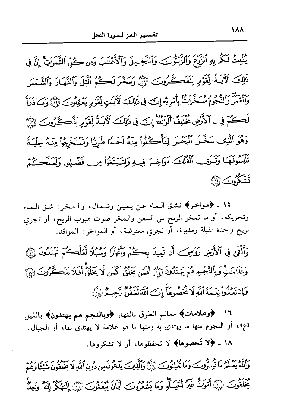 14 - {مَوَاخِرَ} تشق الماء عن يمين وشمال، والمخر: شق الماء وتحريكه، أو ما تمخر الريح من السفن والمخر صوت هبوب الريح، أو تجري بريح واحدة مقبلة ومدبرة، أو تجري معترضة، أو المواخر: المواقد. {وألقى في الأرض رواسى أن تميد بكم وأنهاراً وسبلاً لعلكم تهتدون وعلامات والنجم هم يهتدون أفمن يخلق كمن لا يخلق أفلا تذكرون وإن تعدّوا نعمة الله لا تحصوها إنّ الله لغفورٌ رحيمٌ}