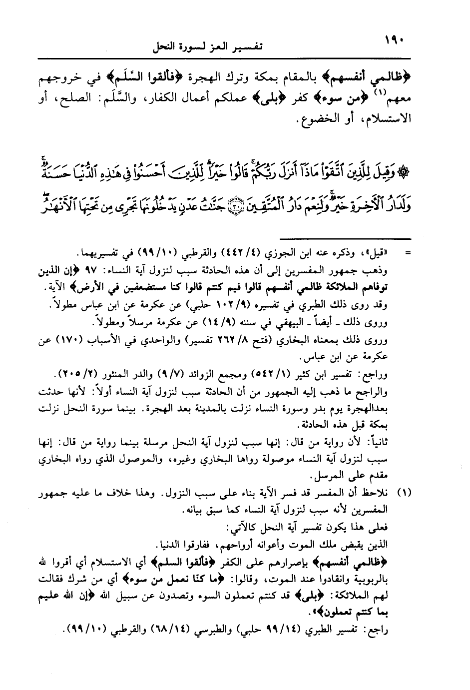 {ظَالِمِى أَنفُسِهِمْ} بالمقام بمكة وترك الهجرة {فَأَلْقَوُاْ السَّلَمَ} في خروجهم معهم {مِن سُوءِ} كفر {بلي} علمكم أعمال الكفار، والسَّلَم: الصلح، أو الاستسلام، أو الخضوع. {وقيل للذين أتقوا ماذا أنزل ربّكم قالوا خيراً للذين أحسنوا في هذه الدنيا حسنةٌ ولدار الآخرة خيرٌ ولنعم دار المتقين جنات عدنٍ يدخلونها تجري من تحتها الأنهار