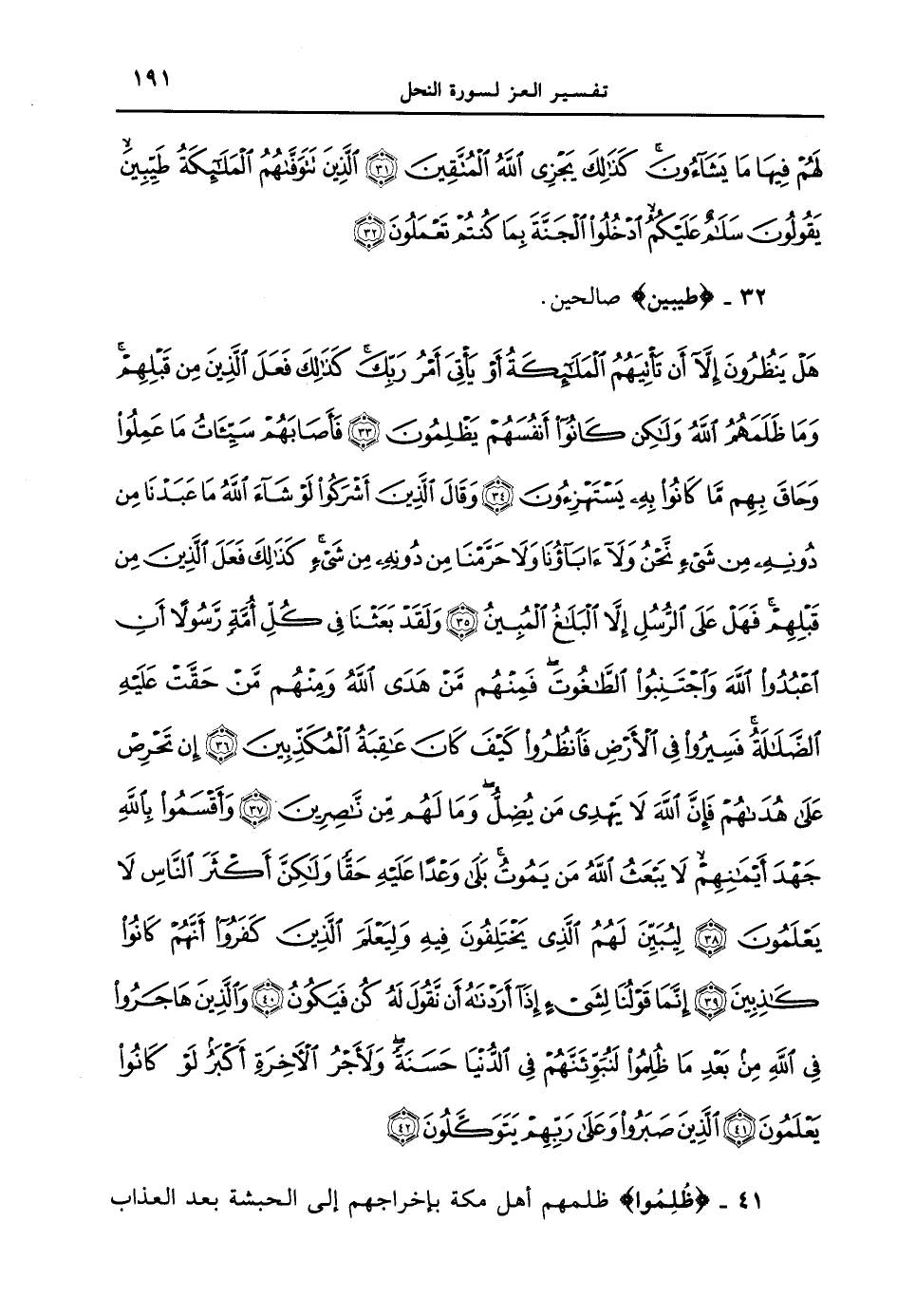 32 - {طيبين) {صالحين} (هل ينظرون إلا أن تأتيهم الملائكة أو يأتي أمر ربك كذلك فعل الذين من قبلهم وما ظلمهم الله ولكن كانوا أنفسهم يظلمون فأصابهم سيئات ما عملوا وحاق بهم ما كانوا به يستهزءون وقال الذين أشركوا لو شاء الله ما عبدنا من دونه من شيءٍ نحن ولا ءاباؤنا ولا حرمنا من دونه من شيءٍ كذلك فعل الذين من قبلهم فهل على الرسل إلا البلاغ المبين ولقد بعثنا في كل أمةٍ رسولاً أن اعبدوا الله واجتنبوا الطاغوت فمنهم من هدى الله ومنهم من حقّت عليه الضلالة فسيروا في الأرض فانظروا كيف كان عاقبة المكذبين إن تحرص على هداهم فإن الله لا يهدي من يضلّ وما لهم من ناصرين وأقسموا بالله جهد أيمانهم لا يبعث الله من يموت بلى وعداً عليه حقاً ولكن أكثر الناس لا يعلمون ليبين لهم الذي يختلفون فيه وليعلم الذين كفروا أنهم كانوا كاذبين إنّما قولنا لشىءٍ إذا أردناه أن نقول له كن فيكون والذين هاجروا في الله من بعد ما ظلموا لنبؤئنّهم في الدنيا حسنة ولأجر الآخرة أكبر لو كانوا يعملون الذين صبروا وعلى ربّهم يتوكلون} 41 - {ظُلِمُواْ} ظلمهم أهل مكة بإخراجهم إلى الحبشة بعد العذاب