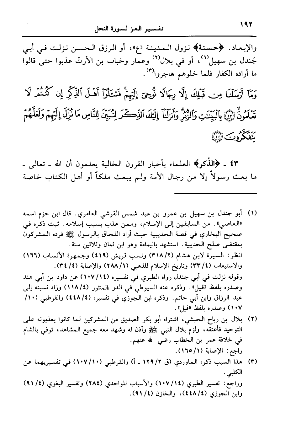 43 - {الذِّكْرِ} العلماء بأخبار القرون الخالية يعلمون أن الله - تعالى - ما بعث رسولاً إلا من رجال الأمة ولم يبعث ملكاً أو أهل الكتاب خاصة