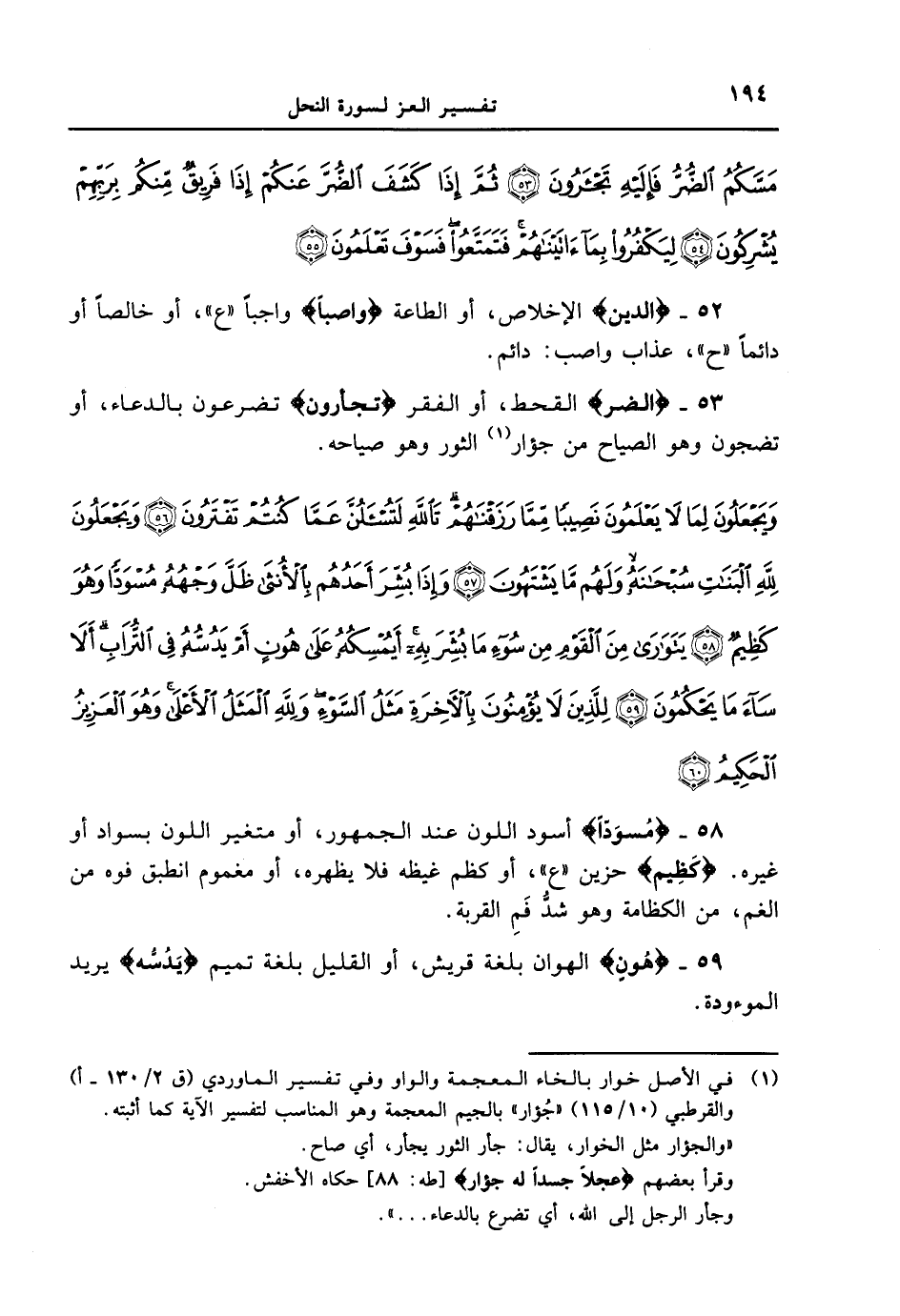 53 - {الضر} القحط، أو الفقر {تجأرون} تضرعون بالدعاء، أو تضجون وهو الصياح من جؤار الثور وهو صياحه. {ويجعلون لما لا يعلمون نصيباً مما رزقناهم تالله لتسئلن عما كنتم تفترون ويجعلون لله البنات سبحانه ولهم ما يشتهون وإذا بشر أحدهم بالأنثى ظل وجهه مسوداً وهو كظيم يتوارى من القوم من سوء ما بشر به أيمسكه على هونٍ أم يدسه في التراب إلا ساء ما يحكمون للذين لا يؤمنون بالأخرة مثل السوء ولله المثل الأعلى وهو العزيز الحكيم}