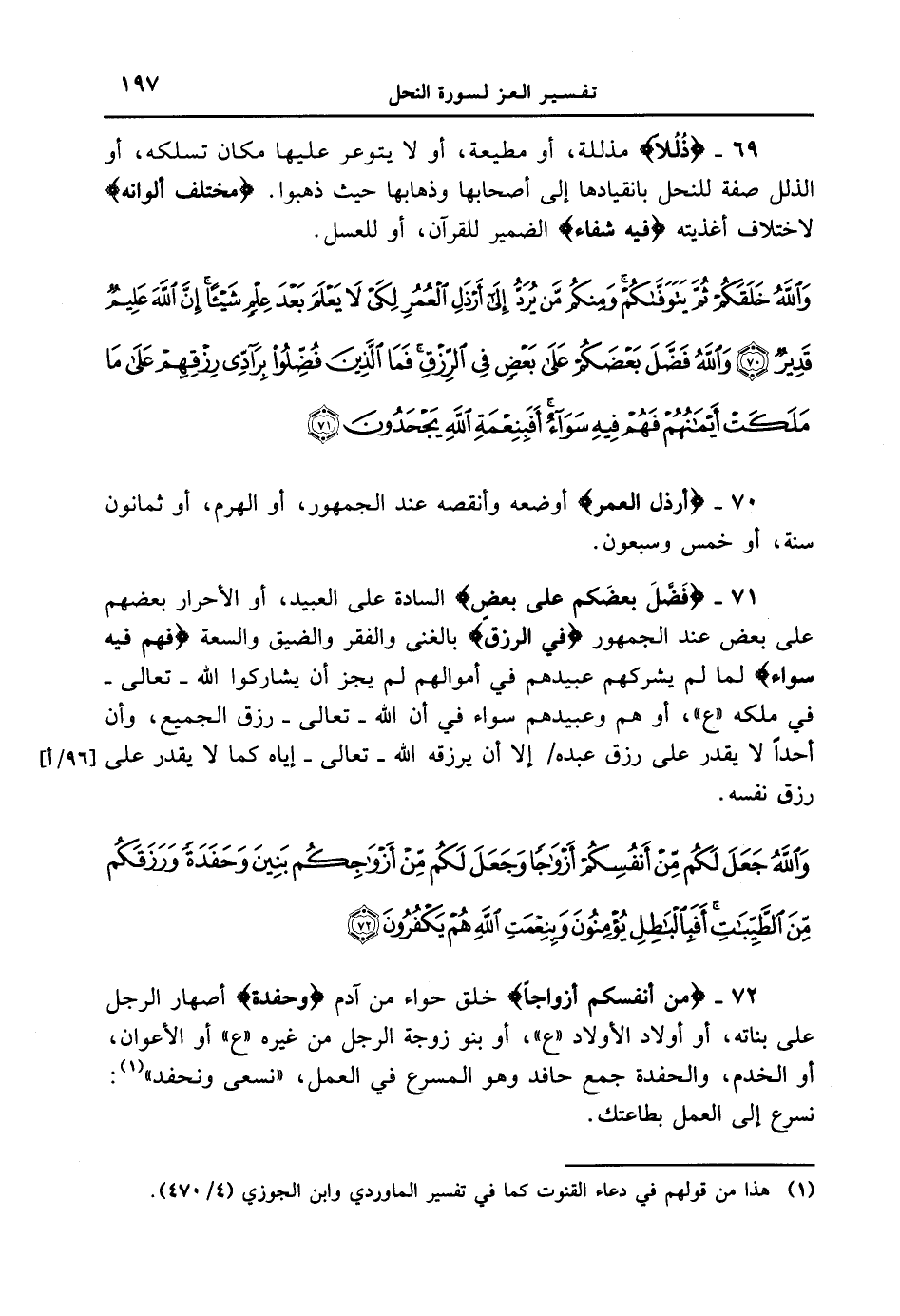 69 - {ذُلُلاً} مذللة، أو مطيعة، أو لا يتوعر عليها مكان تسلكه، أو الذلل صفة للنحل بانقيادها إلى أصحابها وذهابها حيث ذهبوا. {مًّخْتَلِفٌ ألْوَانُهُ} لاختلاف أغذيته {فِيهِ شِفَآءٌ} الضمير للقرآن، أو للعسل. {والله خلقكم ثم يتوفاكم ومنكم من يرد إلى أرذل العمر لكي لا يعلم بعد علم شيئا إن الله عليم قدير والله فضل بعضكم على بعض في الرزق فما الذين فضلوا برادي رزقهم على ما ملكت أيمانهم فهم فيه سواء أفبنعمة الله يجحدون}