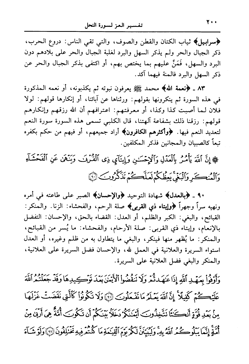 83 - {نعمة الله} محمد [صلى الله عليه وسلم] يعرفون نبوته ثم يكذبونه، أو نعمه المذكورة في هذه السورة ثم ينكرونها بقولهم: ورثناها عن آبائنا، أو إنكارها قولهم: لولا فلان لما أصبت كذا وكذا، أو معرفتهم: اعترافهم أن الله رزقهم وأنكارهم قولهم: رزقنا ذلك بشفاعة آلهتنا، قال الكلبي تسمى هذه السورة سورة النعيم لتعديد النعم فيها. {وَأَكْثَرُهُمُ الْكَافِرُونَ} أراد جميعهم، أو فيهم من حكم بكفره تبعاً كالصبيان والمجانين فذكر المكلفين. {إن الله يأمر بالعدل والإحسان وإيتائ ذي القربى وينهى عن الفحشاء والمنكر والبغى يعظكم لعلكم تذكرون}