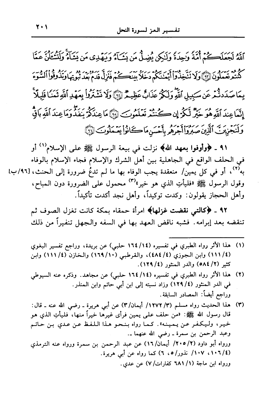 91 - {وَأَوْفُواْ بِعَهْدِ اللَّهِ} نزلت في بيعة الرسول [صلى الله عليه وسلم] على الإسلام أو في الحلف الواقع في الجاهلية بين أهل الشرك والإسلام فجاء الإسلام بالوفاء به، أو في كل يمين / [96 / ب] منعقدة يجب الوفاء بها ما لم تدعُ ضرورة إلى الحنث، وقول الرسول [صلى الله عليه وسلم] " فليأتِ الذي هو خير " محمول على الضرورة دون المباح، وأهل الحجاز يقولون: وكدت توكيداً وأهل نجد أكدت تأكيداً.