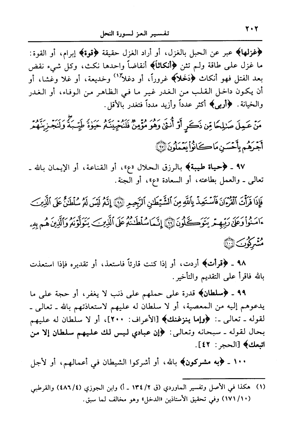 97 - {حَيَاةً طَيِّبَةً} بالرزق الحلال " ع "، أو القناعة، أو الإيمان بالله - تعالى - والعمل بطاعته، أو السعادة " ع "، أو الجنة. {فإذا قرأت القرءان فاستعذ بالله من الشيطان الرّجيم إنّه ليس له سلطان على الذين ءامنوا وعلى ربّهم يتوكّلون إنّما سلطانه على الذين يتولونه والذين هم به مشركون 100}