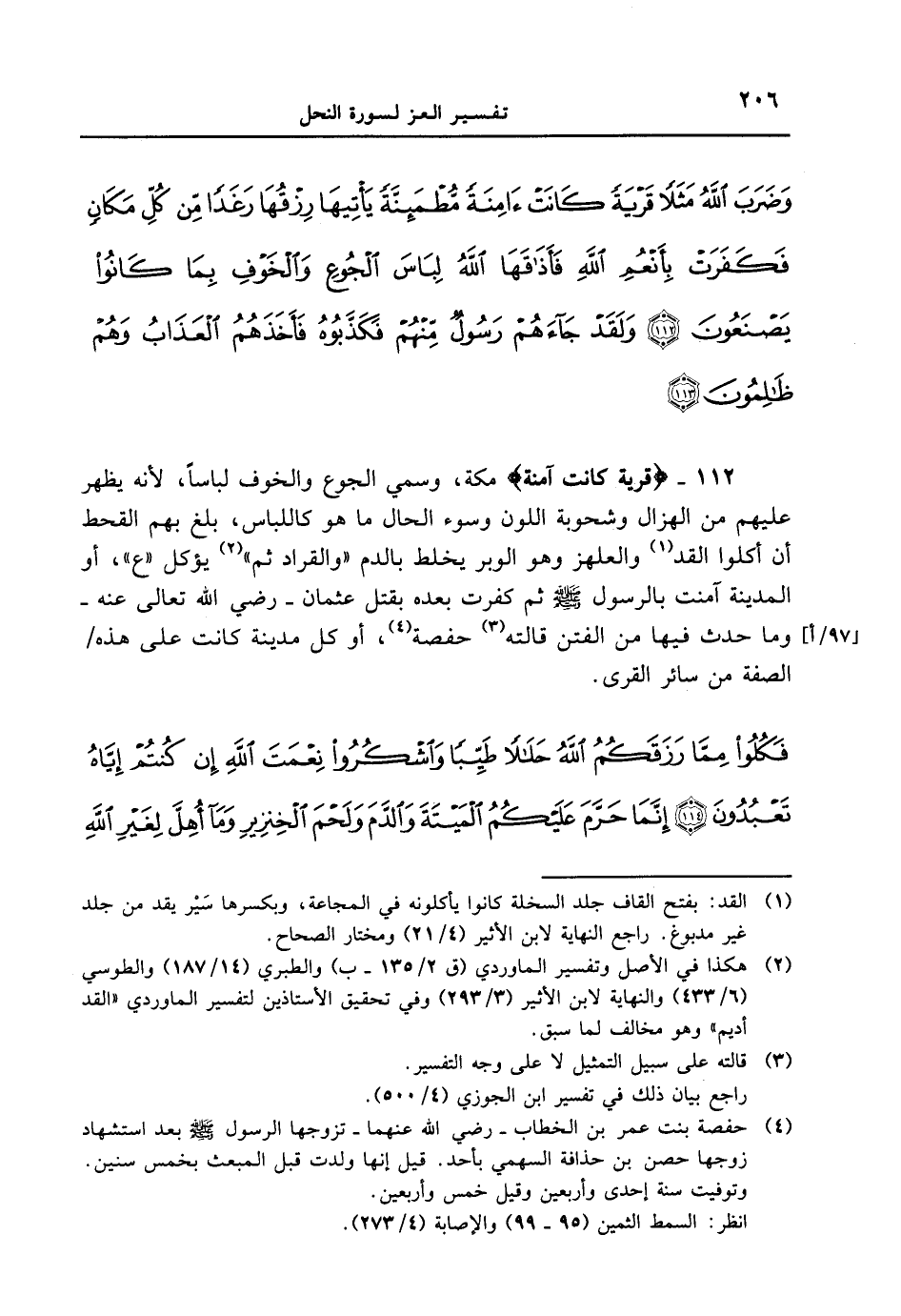 112 - {قرية كانت آمنة} مكة، وسمي الجوع والخوف لباساً، لأنه يظهر عليهم من الهزال وشحوبة اللون وسوء الحال ما هو كاللباس، بلغ بهم القحط أن أكلوا القد والعلهز وهو الوبر يخلط بالدم " والقراد ثم " يؤكل " ع "، أو المدينة آمنت بالرسول [صلى الله عليه وسلم] ثم كفرت بعده بقتل عثمان - رضي الله تعالى عنه - وما حدث فيها من الفتن قالته حفصة، أو كل مدينة كانت على هذه [97 / أ] الصفة من سائر القرى. {فكلوا ممّا رزقكم الله حلالاً طيّباً واشكروا نعمت الله إن كنتم إيّاه تعبدون إنّما حرّم عليكم الميتة والّدم ولحم الخنزير وما أهل لغير الله