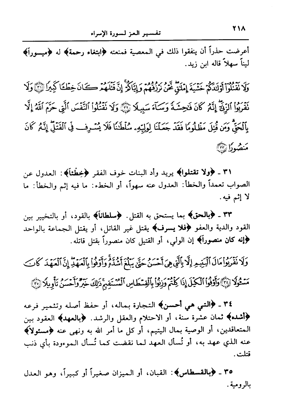 33 - {بِالْحَقِّ} بما يستحق به القتل. {سُلْطَاناً} بالقود، أو بالتخيير بين القود والدية والعفو {فَلا يُسْرِف} يقتل غير القاتل، أو يقتل الجماعة بالواحد {إِنَّهُ كَانَ مَنصُوراً} إن الولي، أو القتيل كان منصوراً بقتل قاتله. {وَلاَ تَقْرَبُواْ مَالَ اليتيم إِلاَّ بالتي هِيَ أحسن حتى يبلغ أشّده وأوفوا بالعهد إن العهد كان مسئولاً وأوفوا الكيل إذا كلتم وزنوا بالقسطاس المستقيم ذلك خيرٌ وأحسن تأويلاً}