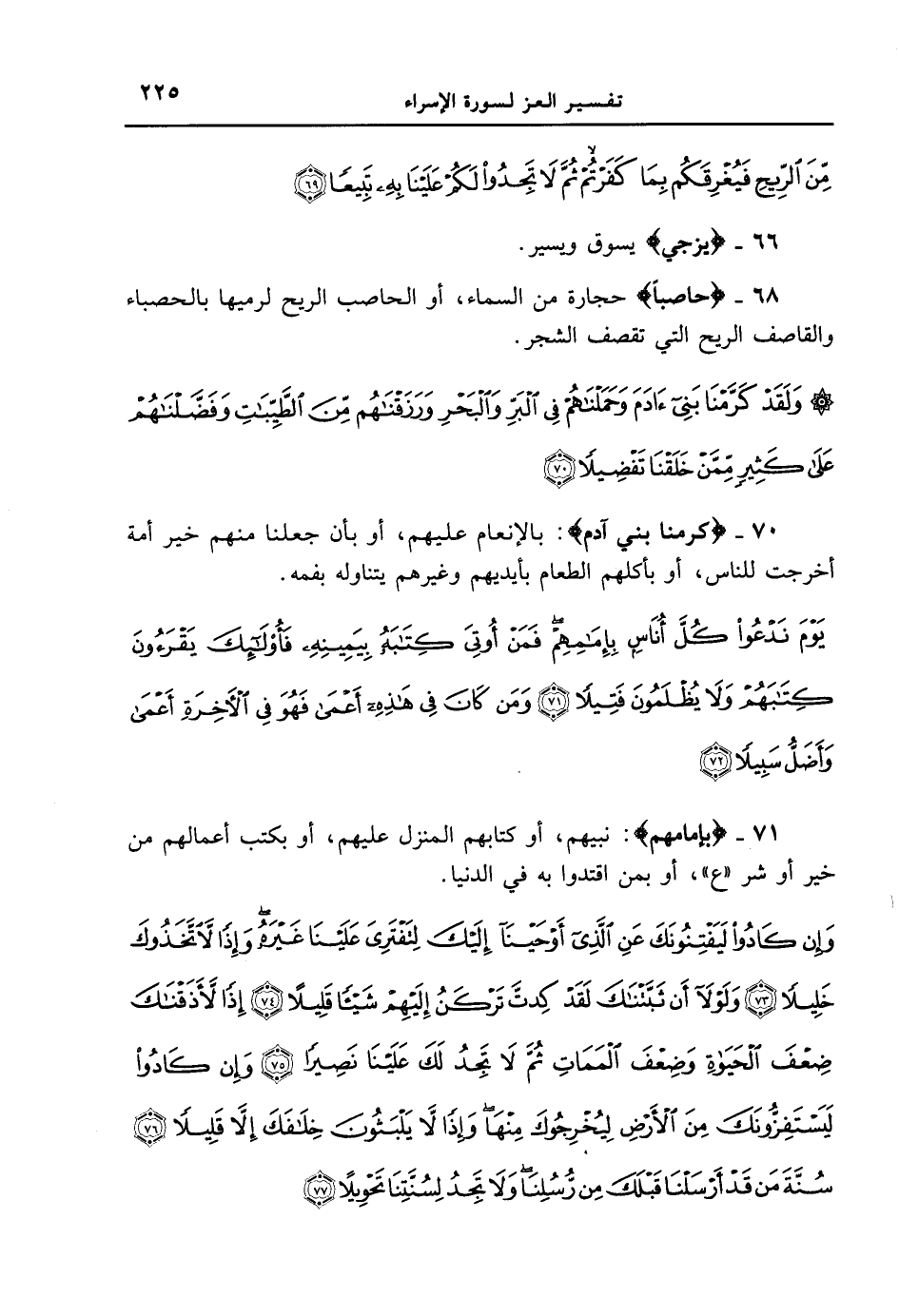 من الريح فيغرقكم بما كفرتم ثم لاتجدوا لكم علينا به تبيعاً} 66 - {يُزْجِى} يسوق ويسير. 67 - {حَاصِباً} حجارة من السماء، أو الحاصب الريح لرميها بالحصباء والقاصف الريح التي تقصف الشجر. {ولقد كرّمنا بني ءادم وحملناهم في البر والبحر ورزقناهم من الطيبات وفضلناهم على كثير ممن خلقنا تفضيلاً} 70 - {كرمنا بني آدم} : بالإنعام عليهم، أو بأن جعلنا منهم خير أمة أُخرجت للناس، أو بأكلهم الطعام بأيديهم وغيرهم يتناوله بفمه. {يوم ندعوا كل أناس بإمامهم فهن أوتى كتابه بيمينه فأولئك يقرءون كتابهم ولا يظلمون فتيلاً 71 ومن كان في هذه أعمى فهو في الآخرة أعمى وأضل سبيلاً}