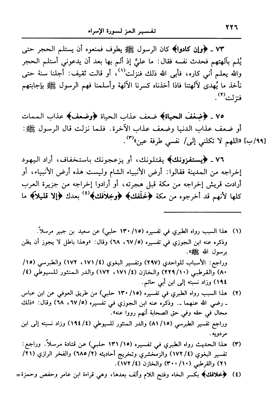 73 - {وإن كادوا} كان الرسول [صلى الله عليه وسلم] يطوف فمنعوه أن يستلم الحجر حتى يُلم بآلهتهم فحدث نفسه فقال: ما عليَّ إذ ألم بها بعد أن يدعوني أستلم الحجر والله يعلم أني كاره، فأبى الله ذلك فنزلت، أو قالت ثقيف: أجلنا سنة حتى نأخذ ما يُهدى لآلهتنا فاذا أخذناه كسرنا الآلهة وأسلمنا فهم الرسول [صلى الله عليه وسلم] فإجابتهم فنزلت.