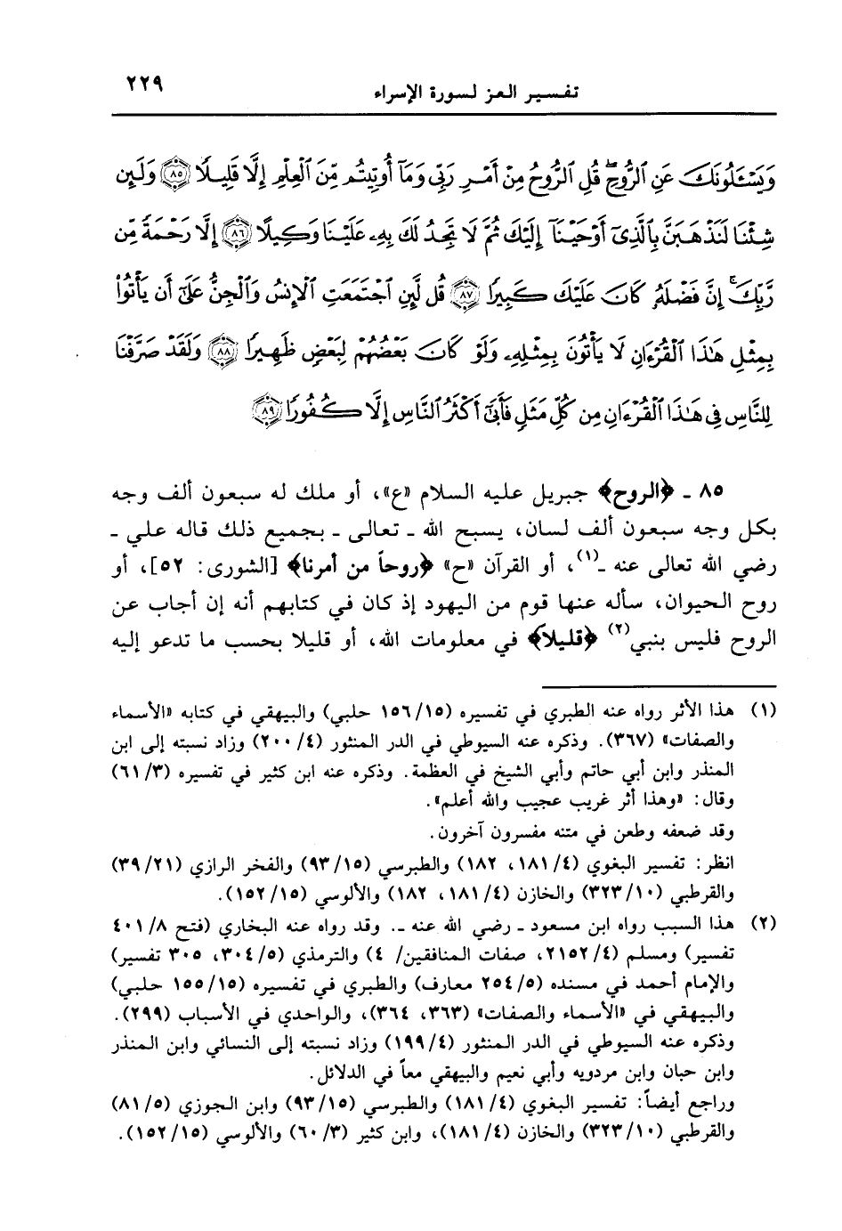 85 - {الرُّوحِ} جبريل عليه السلام " ع "، أو ملك له سبعون ألف وجه بكل وجه سبعون ألف لسان، يسبح الله - تعالى - بجميع ذلك قاله علي - رضي الله تعالى عنه -، أو القرآن " ح " {رُوحاً مِّنْ أَمْرِنَا} [الشورى: 52] ، أو روح الحيوان، سأله عنها قوم من اليهود إذ كان في كتابهم أنه إن أجاب عن الروح فليس بنبي {قَلِيلاً} في معلومات الله، أو قليلاً بحسب ما تدعو إليه