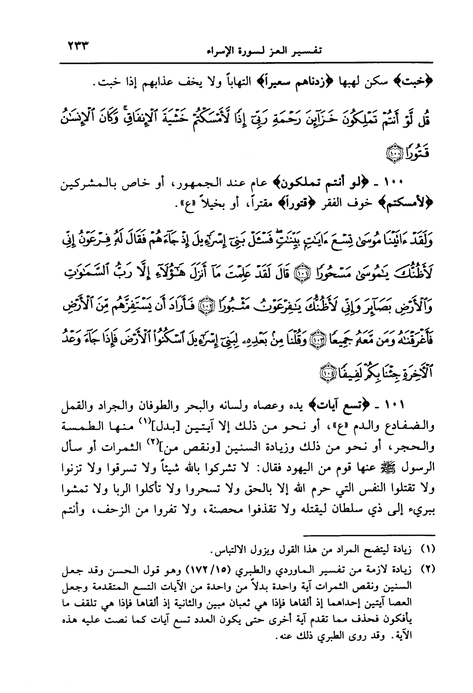 100 - {لَّوْ أَنتُمْ تَمْلِكُونَ} عام عند الجمهور، أو خاص بالمشركين {لأَمْسَكْتُمْ} خوف الفقر {قَتُوراً} مقتراً، أو بخيلاً " ع ". {ولقد ءايتنا موسى تسع ءايات بينات فسئل بنى إسرآئيل إذ جآءهم فقال له فرعون إنى لأظنّك يا موسى مسحوراً قال لقد علمت مآ أنزل هؤلاء إلا رب السماوات والأرض بصآئر وإنى لأظنك يا فرعون مثبوراً فأراد أن يستفزّهم من الأرض فأغرقناه ومن معه جميعاً وقلنا من بعده لبنى إسرئيل اسكنوا الأرض فإذا جآء وعد الأخرة جئنا بكم لفيفاً 104}