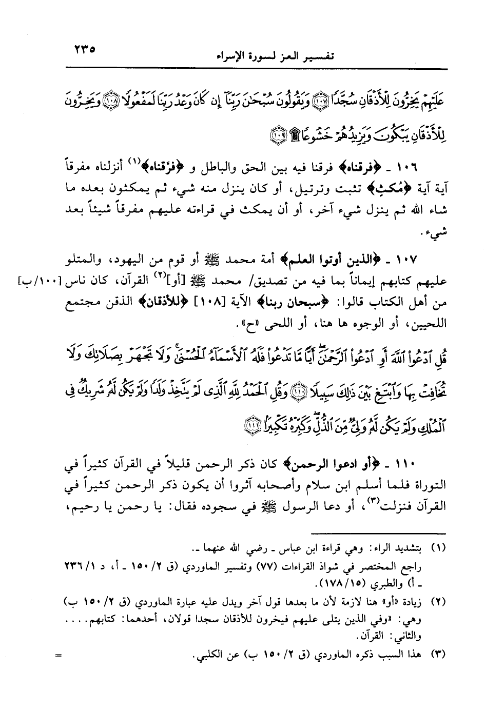 106 - {فَرَقْنَاهُ} فرقنا فيه بين الحق والباطل و {فرَّقناه} أنزلناه مفرقاً آية آية {مُكْثٍ} تثبت وترتيل، أو كان ينزل منه شيء ثم يمكثون بعده ما شاء الله ثم ينزل شيء أخر، أو أن يمكث في قراءته عليهم مفرقاً شيئاً بعد شيء. 107 {الَّذِينَ أُوتُواْ العلم} أمة محمد [صلى الله عليه وسلم] أو قوم من اليهود، والمتلو عليهم كتابهم إيماناً بما فيه من تصديق / [100 / ب] محمد [صلى الله عليه وسلم] [أو] القرآن، كان ناس من أهل الكتاب قالوا: {سبحان ربنا} الآية [108] {لِلأَذْقَانِ} الذقن مجتمع اللحيين، أو الوجوه ها هنا، أو اللحى " ح ". {قل ادعوا الله أو ادعوا الرحمن أياً ما تدعوا فله الأسماء الحسنى ولا تجهر بصلاتك ولا تخافت بها وابتغ بين ذلك سبيلا وقل الحمد لله الذي لم يتّخذ ولداً ولم يكن له شريك في الملك ولم يكن له ولىّ من الذل وكبره تكبيراً}