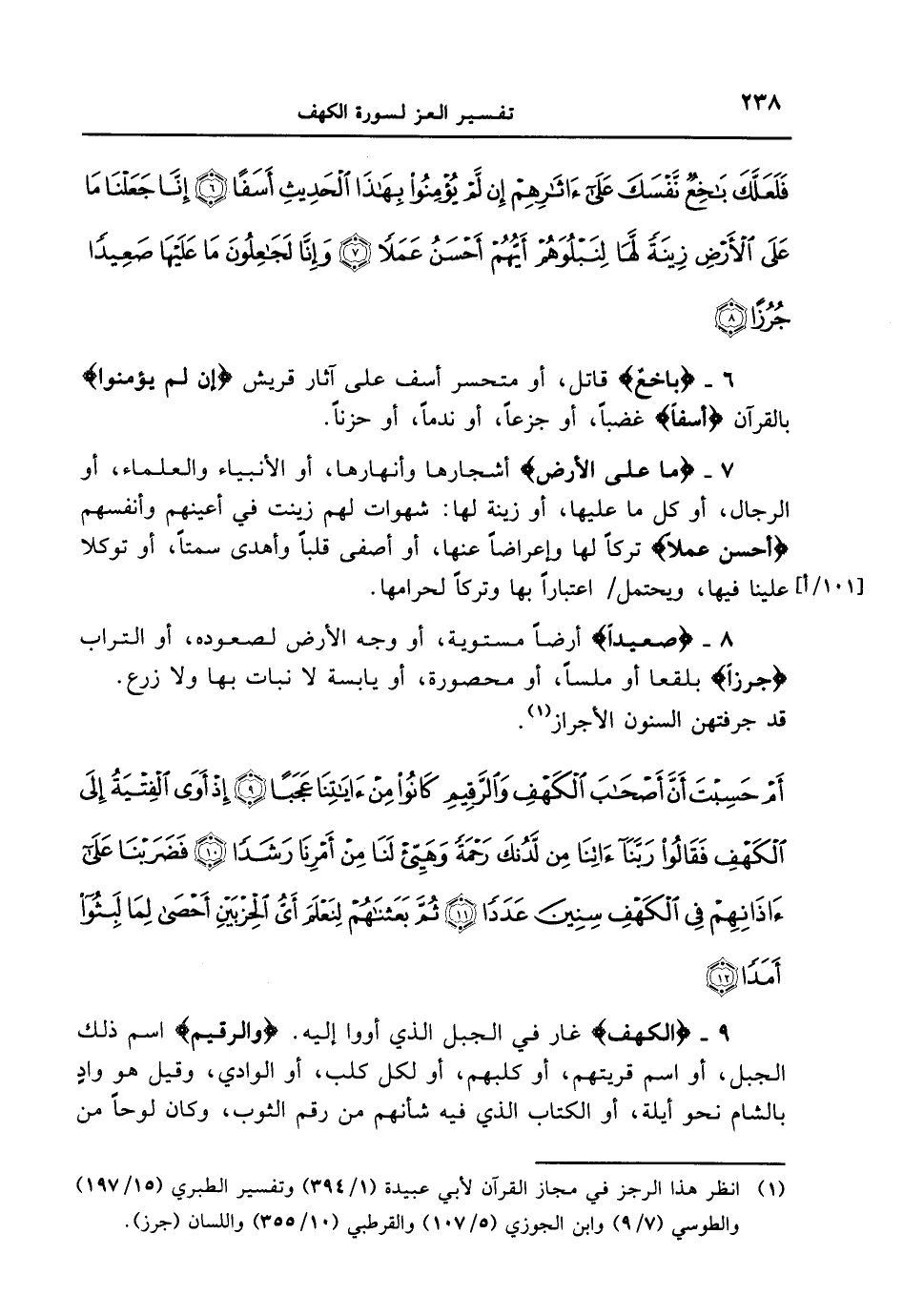 8 - {صَعِيداً} أرضاً مستوية، أو وجه الأرض لصعوده، أو التراب {جُرُزاً} بلقعاً أو ملساً، أو محصورة، أو يابسة لا نبات بها ولا زرع. قد جرفتهن السنون الأجرار. {أم حسبت أنّ أصحاب الكهف والرقيم كانوا من ءاياتنا عجباً إذ أوى الفتية إلى الكهف فقالوا ربّنا ءاتنا من لدنك رحمةً وهيئ لنا من أمرنا رشداً فضربنا علىءاذانهم في الكهف سنين عدداً ثم بعثناهم لنعلم أي الحزبين أحصى لما لبثوا أمداً}