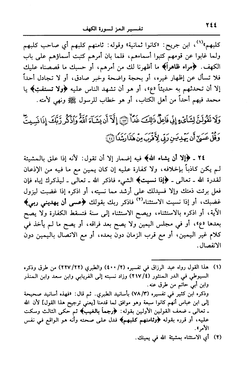 24 - {إِلآ أَن يَشَآءَ اللَّهُ} فيه إضمار إلا أن تقول: لأنه إذا علق بالمشيئة لم يكن كاذباً بأخلافه، ولا كفارة عليه إن كان يمين مع ما فيه من الإذعان لقدرة الله - تعالى - {إِذَا نَسِيتَ} الشيء فاذكر الله - تعالى - ليذكرك إياه فإن فعل برئت ذمتك وإلا فسيدلك على أرشد منا نسيته، أو اذكره إذا غضبت ليزول غضبك، أو إذا نسيت الاستثناء فاذكر ربك بقولك {عسى أن يهديني رَبِّى} الآية، أو اذكره بالاستثناء، ويصح الاستثناء إلى سنة فتسقط الكفارة ولا يصح بعدها " ع "، أو في مجلس اليمين ولا يصح بعد فراقه، أو يصح ما لم يأخذ في كلام غير اليمين، أو مع قرب الزمان دون بعده، أو مع الاتصال باليمين دون الانفصال.