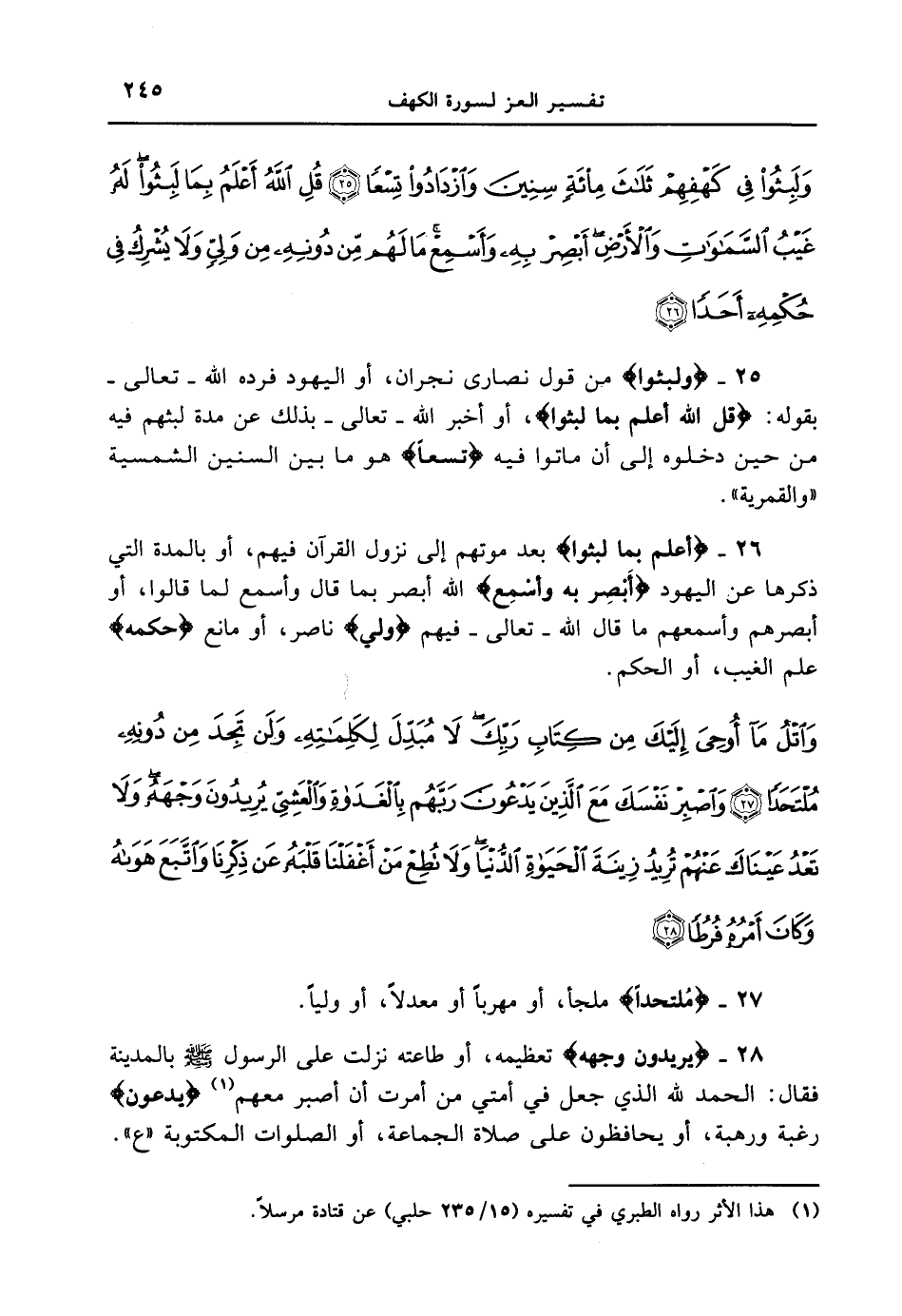 25 - {وَلَبِثُواْ} من قول نصارى نجران، أو اليهود فرده الله - تعالى - بقوله: {قُلِ اللَّهُ أَعْلَمُ بِمَا لَبِثُواْ} ، أو أخبر الله - تعالى - بذلك عن مدة لبثهم فيه من حين دخلوه إلى أن ماتوا فيه {تِسْعاً} هو ما بين السنين الشمسية " والقمرية ".