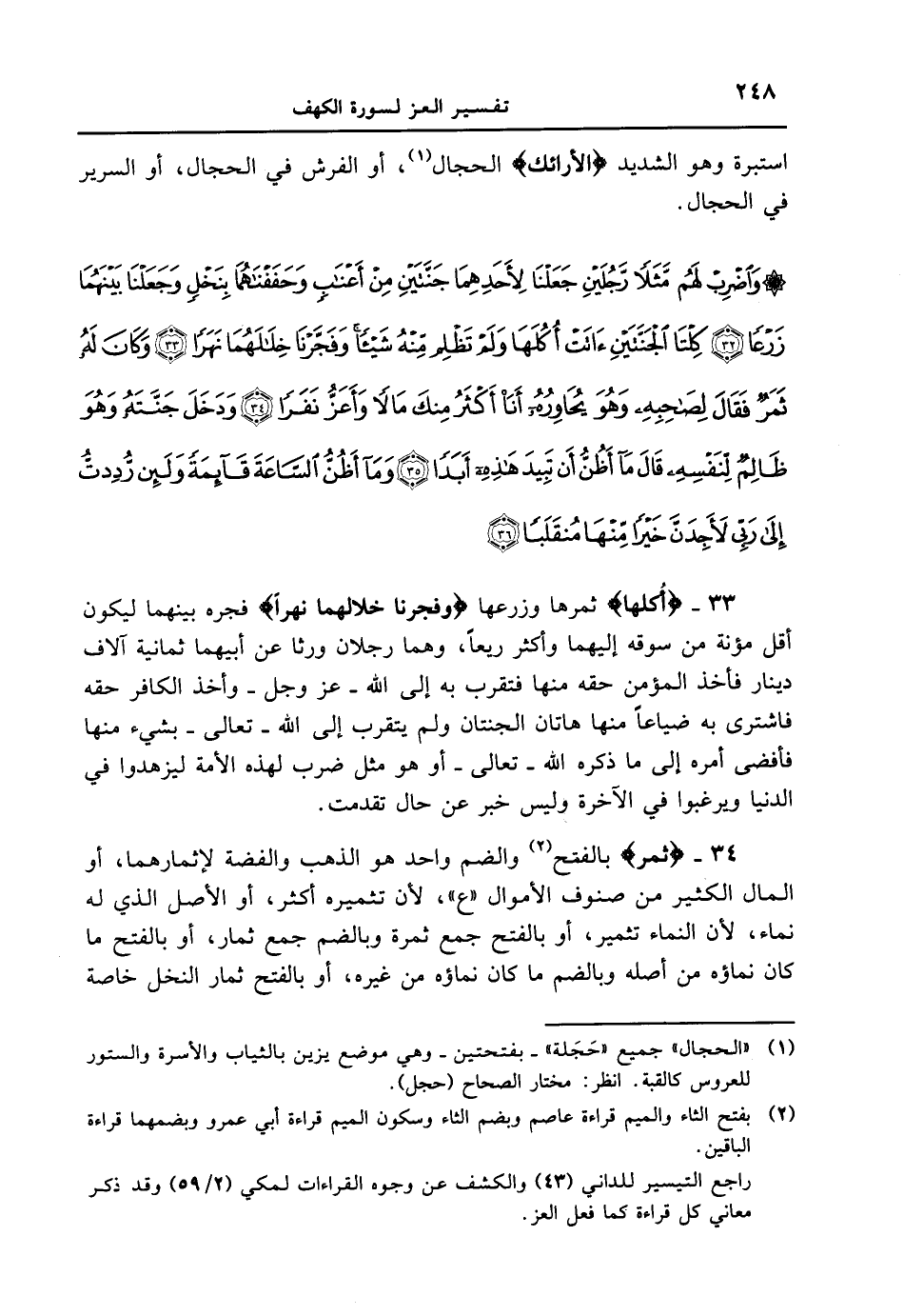 استبرة وهو الشديد {الأَرَآئِكِ} الحجال، أو الفرش في الحجال، أو السرير في الحجال. {واضرب لهم مثلاً رجلين جعلنا لأحدهما جنتين من أعناب وحففناهما بنخلٍ وجعلنا بينهما زرعاً كلتا الجنتين ءاتت أكلها ولم تظلم منه شيئاً وفجرنا خلالهما نهراً وكان له ثمرٌ فقال لصاحبه وهو يحاوره أنا أكثر منك مالاً وأعز نفرا ودخل جنته وهو ظالمٌ لنفسه قال ما أظن أن تبيد هذه أبداً وما أظن الساعة قائمة ولئن رددت إلى ربي لأجدن خيراً منها منقلباً}